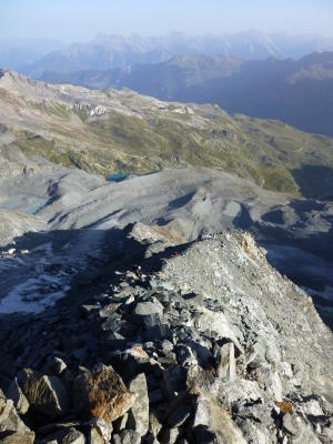 Da das obere Teil von der Grat ausgeapert ist, ist ein Abstieg über die route nicht empfehlenswert. WNW-grat sah nicht wirklich einladend aus (viel loses Gestein).