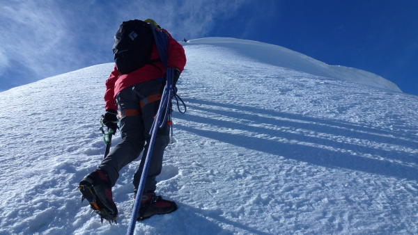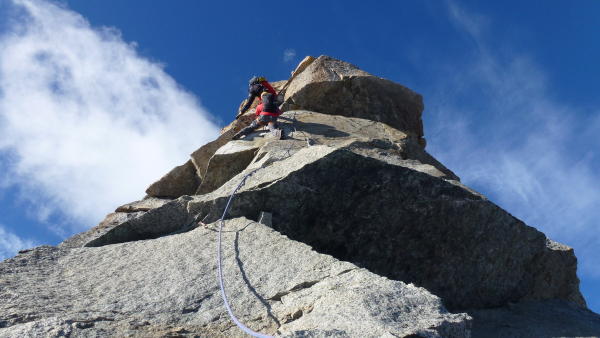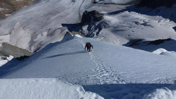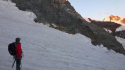 Persgletscher im Bereich Cambrena-Brüche sehr spaltig. Ostpfeiler trocken und sehr gut, aber etwas windig. Ausstieg im Eisfeld mit Schnee bedeckt, guter Tritt, keine Eisschrauben nötig gewesen