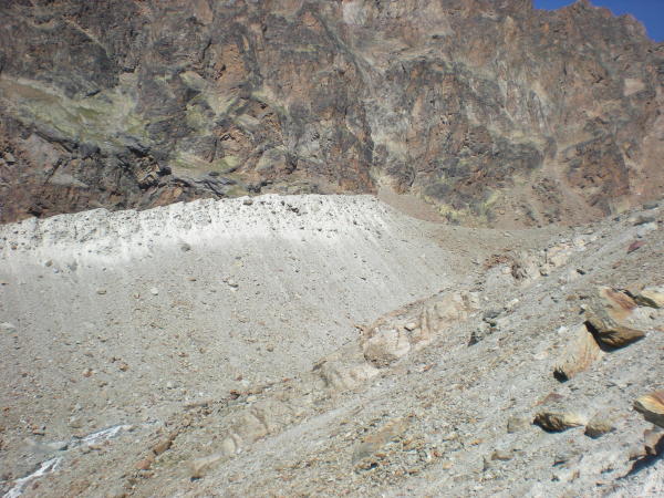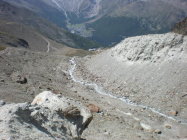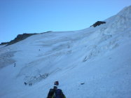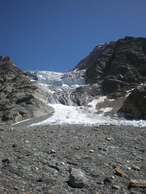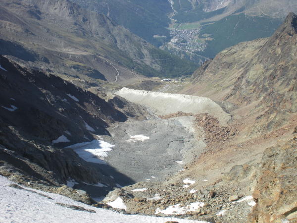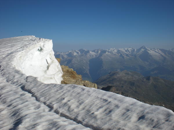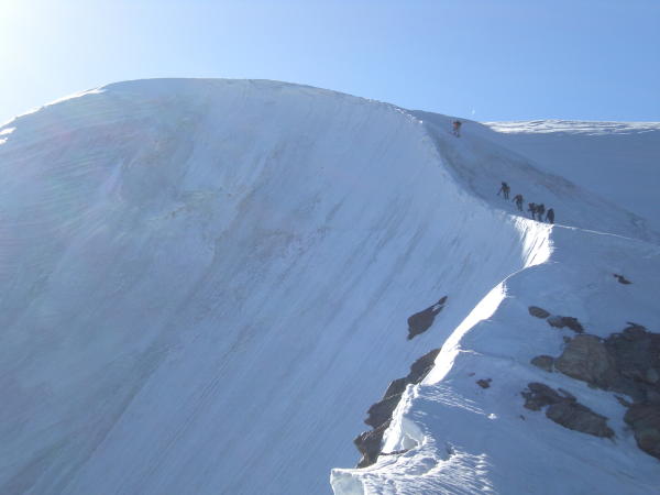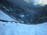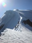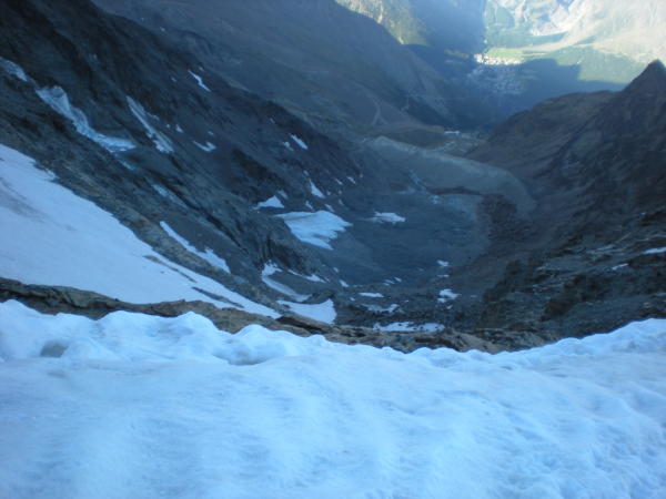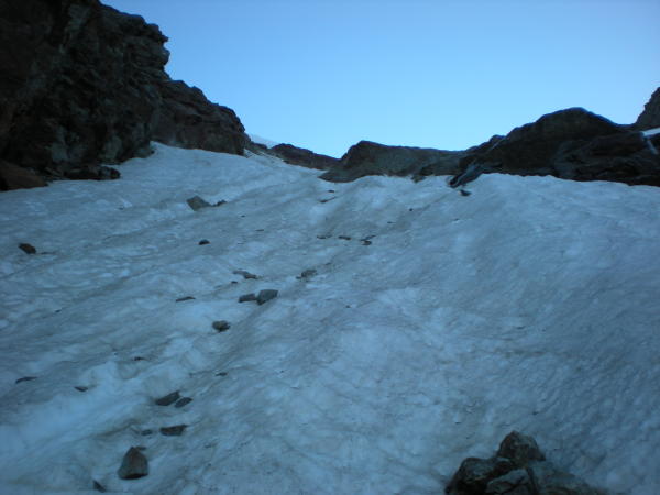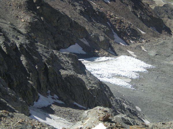 Tälligletscher und weitere Aufschwung schneefrei und gut zu gehen. Teilweise lose Steine, Vorsicht ist angebracht. Östlich von P. 3527 beim Schneefeld hat es eine Blankeisstelle, diese kann über den Fels umgangen werden. Der Nordwestgrat weist eine etwa 50 Meter lange Blankeisstelle auf, schwierig zu begehen, muss mit Schrauben gesichert werden. Wir sind +/- beim Ausstieg Nordwand umgekehrt, der Zeitverlust mit den Schrauben wäre zu gross gewesen.