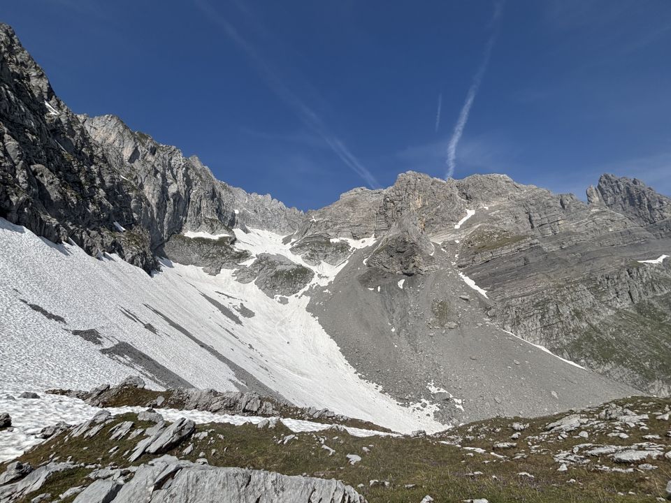 Von ‚Ober Bigaas‘ bis ‚Chasseten‘ hat es noch einige steile Schneefelder zu queren, ging aber problemlos, weil diese schon mitte Morgen weich waren! Der restliche Aufstieg in der erstaunlich festen Ostflanke war trocken und schneefrei.