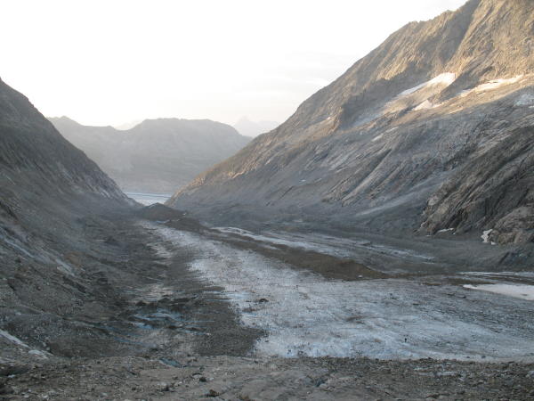 Man kann auf dem Mittealetschgletscher auch eher links absteigen und den Schutthügel links umgehen, muss jedoch für den Gletscherabgang trotzdem nochmals auf die Mittelmoräne aufsteigen.
