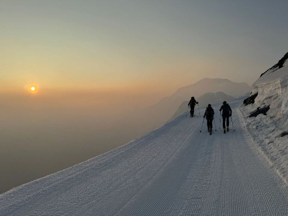 Tour war am 9.6. Dank Kälte und Wind hat es an diesem Tag nur minimal aufgefirnt. Die Verhältnisse waren bis in den Nachmittag hinein perfekt. Man konnte also wie im Hochwinter den ganzen Tag nutzen ohne Stress mit der tageszeitlichen Erwärmung. Diese Route hat den Vorteil, dass man ohne Tragestrecke am Parkplatz starten kann und bis dorthin auch wieder Abfahren kann. Allerdings sind rund 300 Höhenmeter Gegenanstieg zwingend. ACHTUNG: Der in der Karte eingezeichnete "Weg" über den Passo di Campo ist nicht mehr begehbar. Anstatt ostseitig eben auf den Gletscher zu gelangen , müsste man über eine extrem brüchige Felsstufe abklettern. Schade , dass diese Stelle nicht versichert wird.
