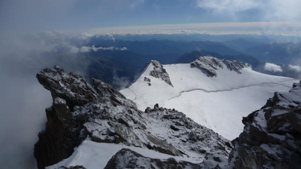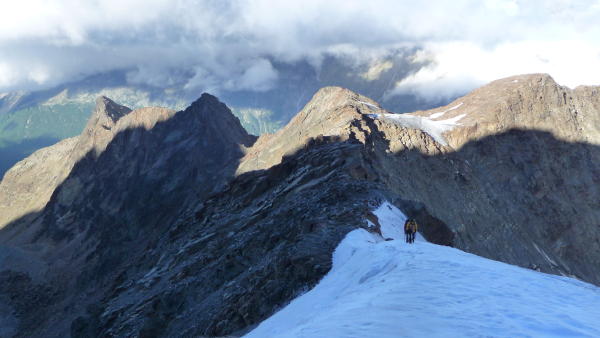 Die Westflanke lässt sich gut traversieren, einige Spalten sind offen und sichtbar. Der Gipfelgrat hart und griffig.