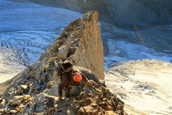 Problemlose Verhältnisse. Beim Übergang vom Gletscher auf den Fels gilt es, die beste Stelle zu finden, das Gelände ist hier teilweise extrem brüchig und geröllig.