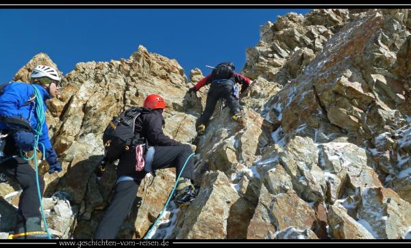 Eigentlich gute Verhältnisse. Am konkreten Gipfeltag aber morgens eisglasierter Fels und Aprilwetter.