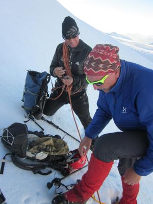 Halbe Breithorntraverse. Der Zustieg über die Gletscher vom Klein Matterhorn weist keine aussergewöhnliche Schwierigkeiten auf. Die Flanke zu den Felsen hat beste Tritte. Die ganze Tour hat viel Schnee, aber mit Steigeisen geht es gut.