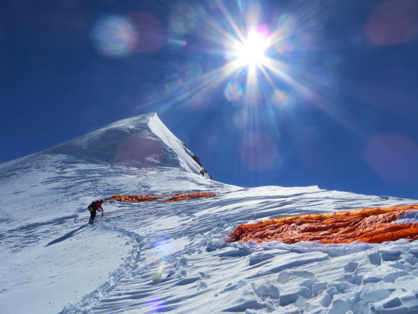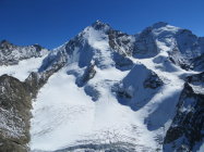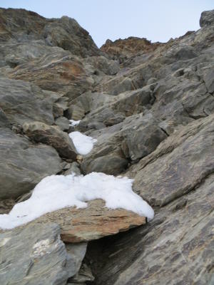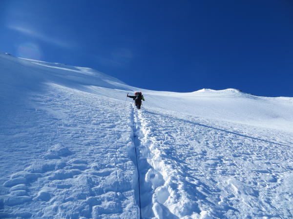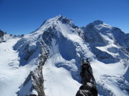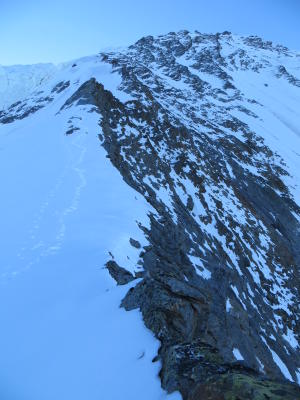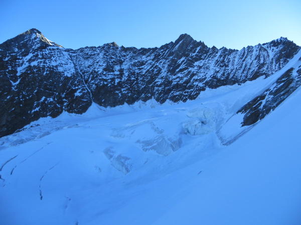 Trocken / ohne Steigeisen bis auf Festijoch. 3700 - 3900m Bruchharst (10cm Einbrechen); 4000-4500m bis zu 40cm Pulver. 0 km/h Wind. ca. 0° auf Gipfel. Festigrat ist auch gespurt (etwas Blankeis im untersten Viertel)