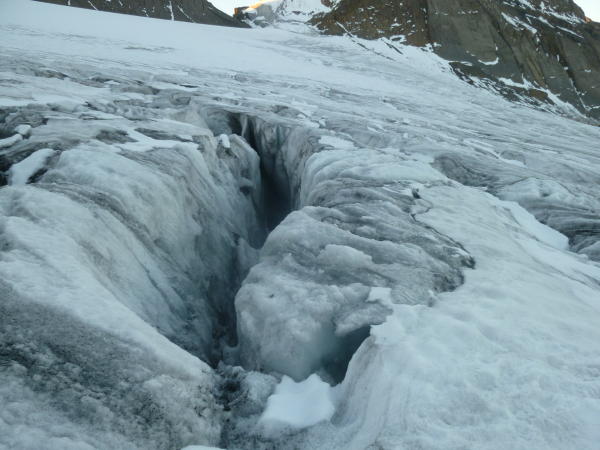 Gletscher weitgehend aper. Die Spaltenzonen können relativ gut überwunden werden. Achtung: die Schneebrücken halten kaum mehr.