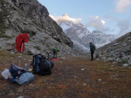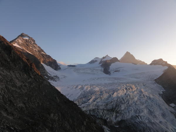 Bei der Schönbielhütte muss frühzeitig reserviert werden. Am Dienstag Abend war die Hütte bereits voll. Nordwestlich der Hütte (den Pfad zum Schönbielgletscher folgend) erreicht man bei P 2704 direkt östlich der Moräne einen idealen flachen Biwakplatz. Die Quelle darüber hilft einem auch noch mit Wasser.