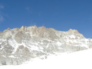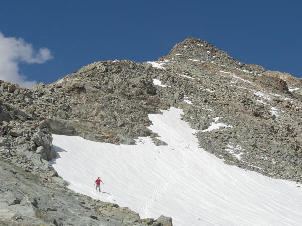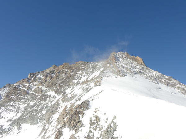 Col Durand - N-Gipfel: Sicherlich 0.2 m recht feuchter Schnee. Schnee ist gut mit Untergrund verbunden. Darunter teilweise harter Firn. Aufstieg über Gletscher problemlos. Unterhalb der Gletscher-Steilstufe muss auf den Bergschrund acht gegeben werden. Dieser kann man derzeit aber gut passieren. Firngrat und Fläche darüber haben derzeit ideale Bedingungen. Oberhalb des Gletscher folgen kurze schneebedeckte Platten. Die Blöcke bis zum Gipfel sind mehr oder weniger mit Schnee bedeckt, was aber nicht hinderlich ist. Gipfelturm ist schneefrei.