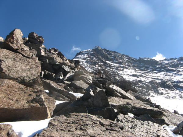 Auf dem Restgletscher gute Verhältnisse, ohne Steigeisen möglich, am Grat gute Verhältnisse, mit Steigeisen gut machbar.