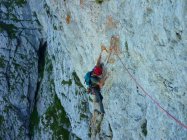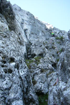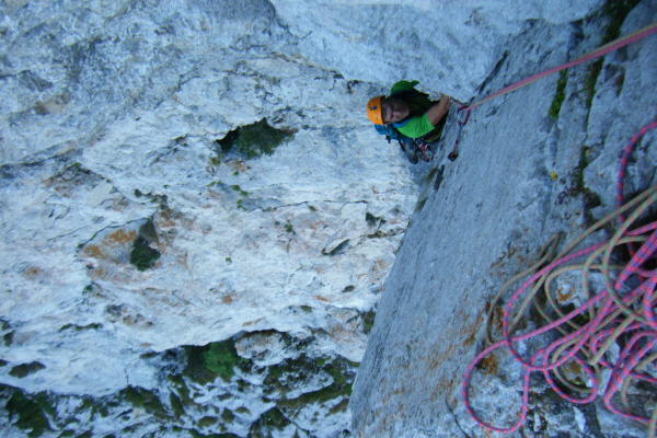 Alpine Absicherung mit Haken und wenigen Bohrhaken. Standplätze unten an einem Bohrhaken plus Schlaghaken.