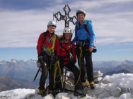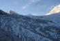 Etwas «Neuschnee» der letzten Wochen auf dem Gletscher. Westflanke unterhalb des Gipfels mit Blankeis. Rechts davon kann man aber gut hochsteigen. Hier hat sich der neue Schnee gut umgewandelt und ist mit den Steigeisen sehr griffig.