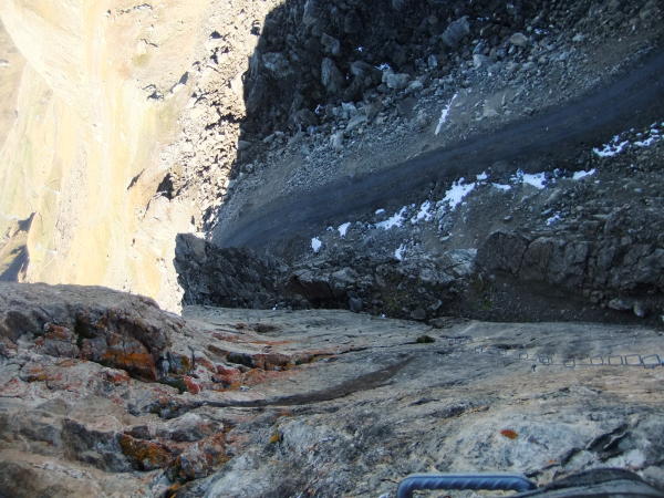 Die Nordwand-Variante (D) ist sehr ausgesetzt und steil. Die Schwierigkeiten des etwa 200 m langen Klettersteigs bewegen sich zwischen B und C, an mehreren ausgesetzten Stellen D. Die Route ist sehr alpin angelegt. Den Füßen wird guter Stand, bzw. Reibung auf dem Gneisfels abverlangt. Ungewöhnlich ist die "Linksdrift" der Griffe im Wandabschnitt immer links vom Drahtseil weg. Entgegen der Gewohnheit, "gerade" nach oben, unten oder quer zu klettern, wird hier eine schiefe Körperhaltung verlangt, nämlich die Hände gegenüber den Füßen, die gerade Stand haben, nach links neu an Griffen anzusetzen versuchen. Damit muß man ständig vom Seil weg klettern und sich entscheiden, die Hände an den raren Eisenbügeln, oder sehr wenigen natürlichen Haltestellen im Fels anzupacken und nicht das Seil. Will man mit den Händen Seil und Griff gleichzeitig anpacken, setzt das manche akrobatische Künste voraus. Jedenfalls bewegt man sich wie eine Fliege an der Fensterscheibe: Immer seinen Körper nah an der Wand dran halten. Dann funktioniert's und man kommt hoch.