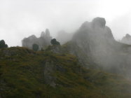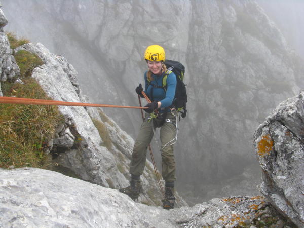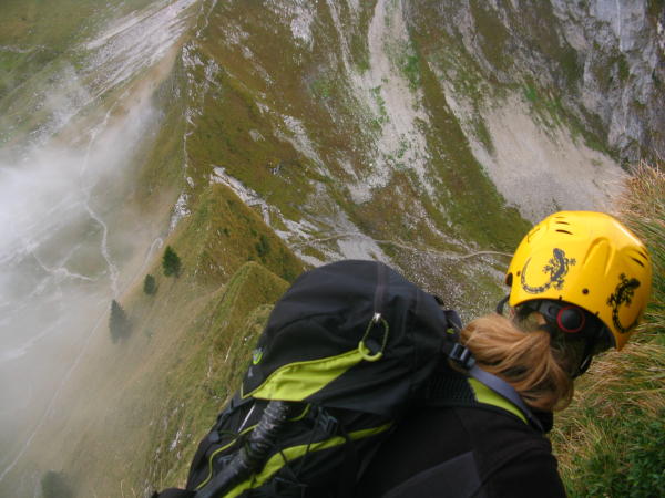 neben dem gemsgrat übers steilgras aufgestiegen.etwa ab der hälfte vom gemsgrat die rechte Variante über ein markantes schmales couloir hinauf und anschliessend über die rechte rippe hinauf bis zur ersten abseilstelle. trotz regen am vormittag gute verhältnisse für auf-und abstieg.an der zweiten abseilstelle ist im moment ein brauchbares seil vorhanden.