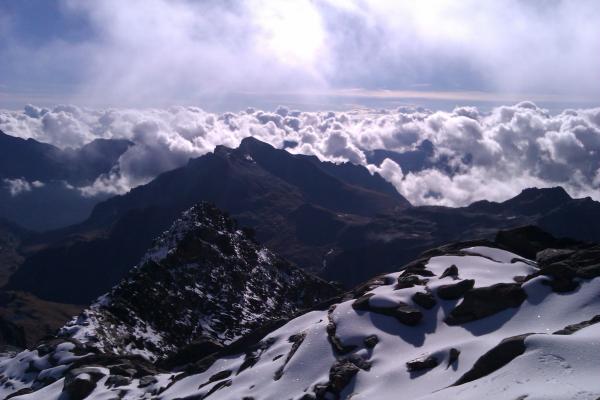 Es hat zwar etwa ab dem Hohsandjoch eine geschlossene Neuschneedecke, doch diese ist nach den relativ warmen und sonnigen Tagen und den kalten Nächten bestens durchgefroren und trägt. Damit ergeben sich ideale Verhältnisse, da man mit den Steigeisen in den felsigen Passagen auf dem Schnee gehen kann. Die Tour auf das Ofenhorn ist immer wieder ein wunderbares Erlebnis und je nach Jahreszeit präsentiert sich dieser herrliche Gipfel wieder neu. Der Schrund am Zugang zum E-Grat ist leicht und bestens zu überwinden.