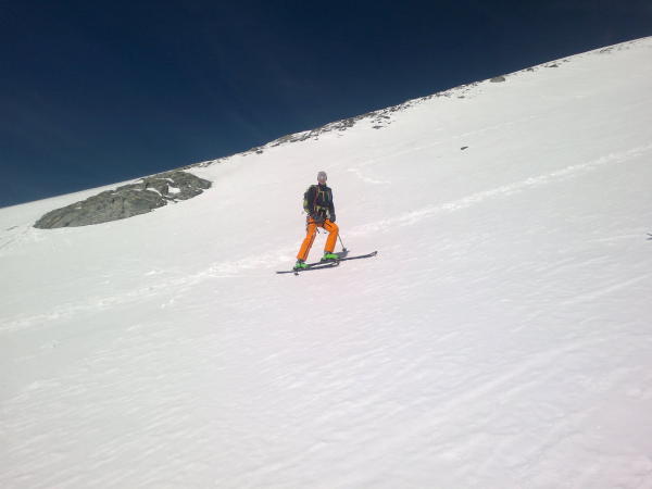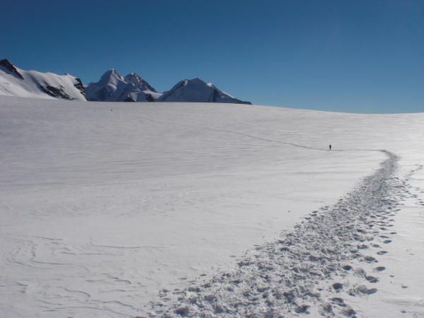 Fantastisches Wetter. Schöne Spur übers Breithornplateau - auch mit Ski gut begehbar. In der Flanke zum Breithorn 20 cm Schnee, teilweise pulvrig, teilweise bereits hart.