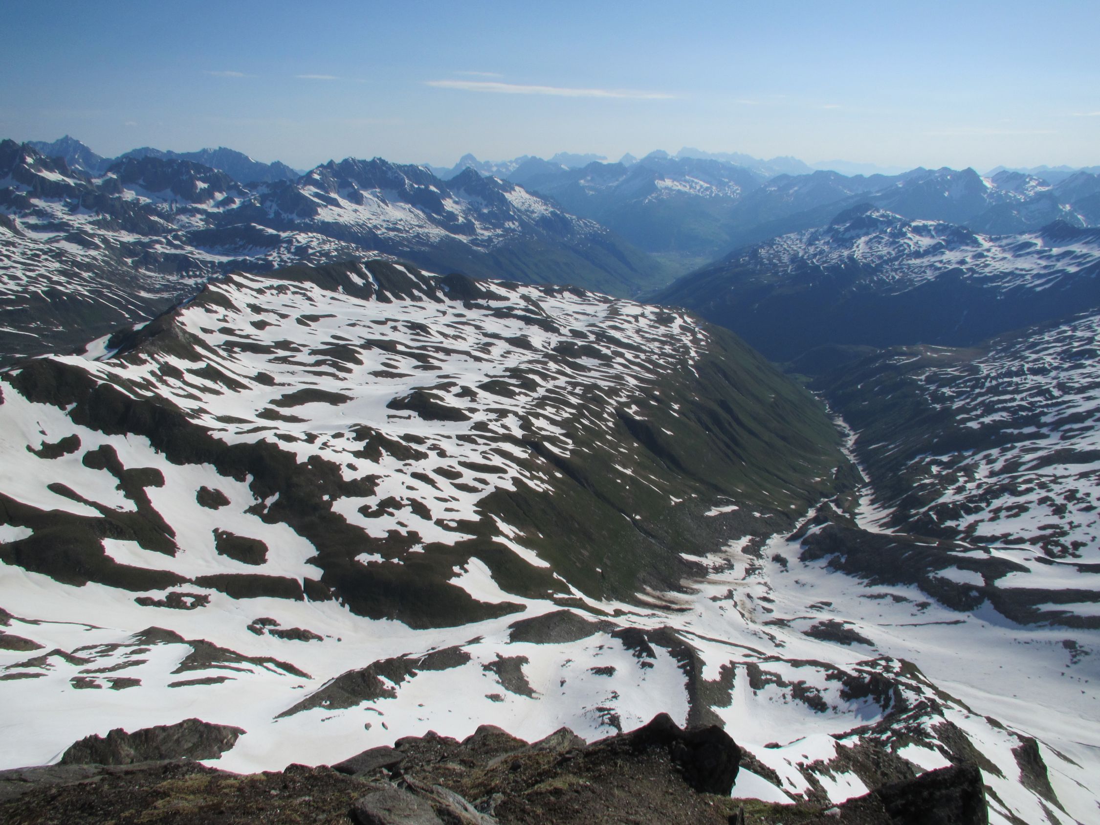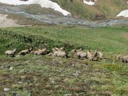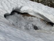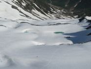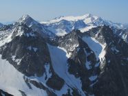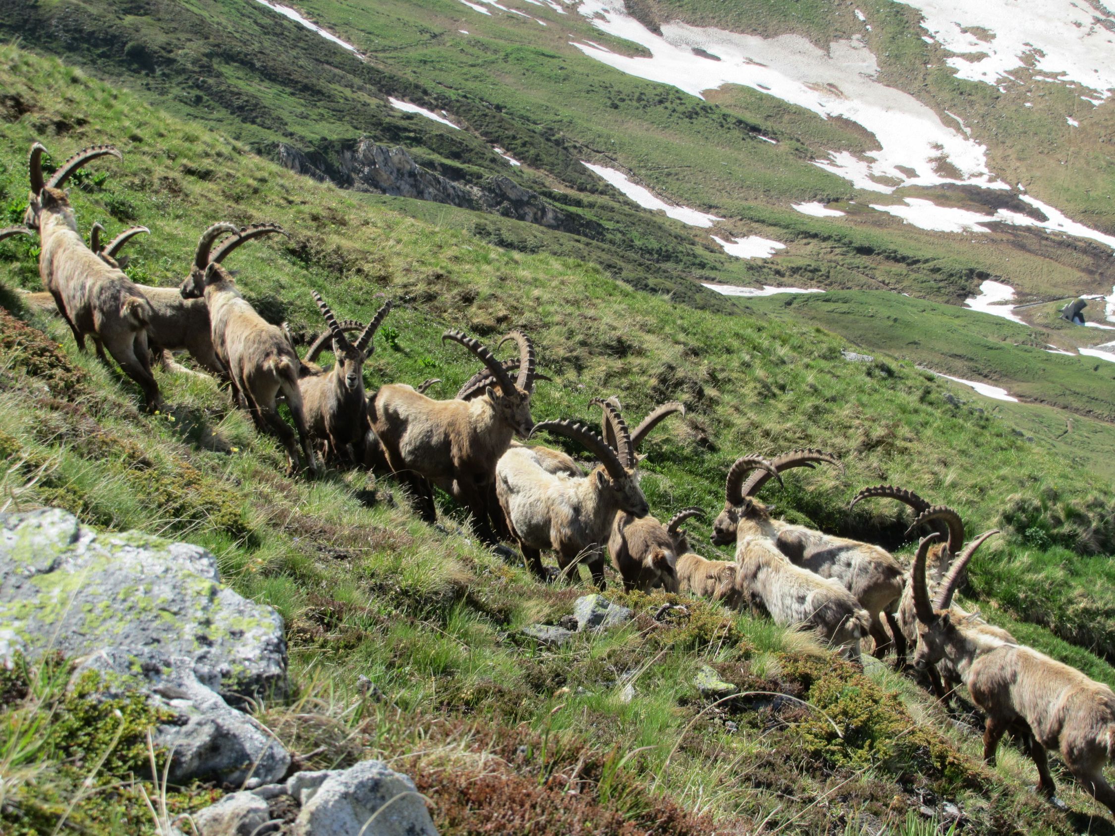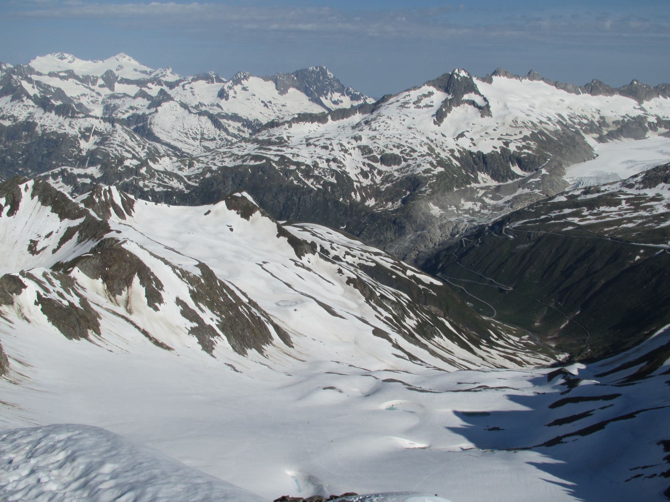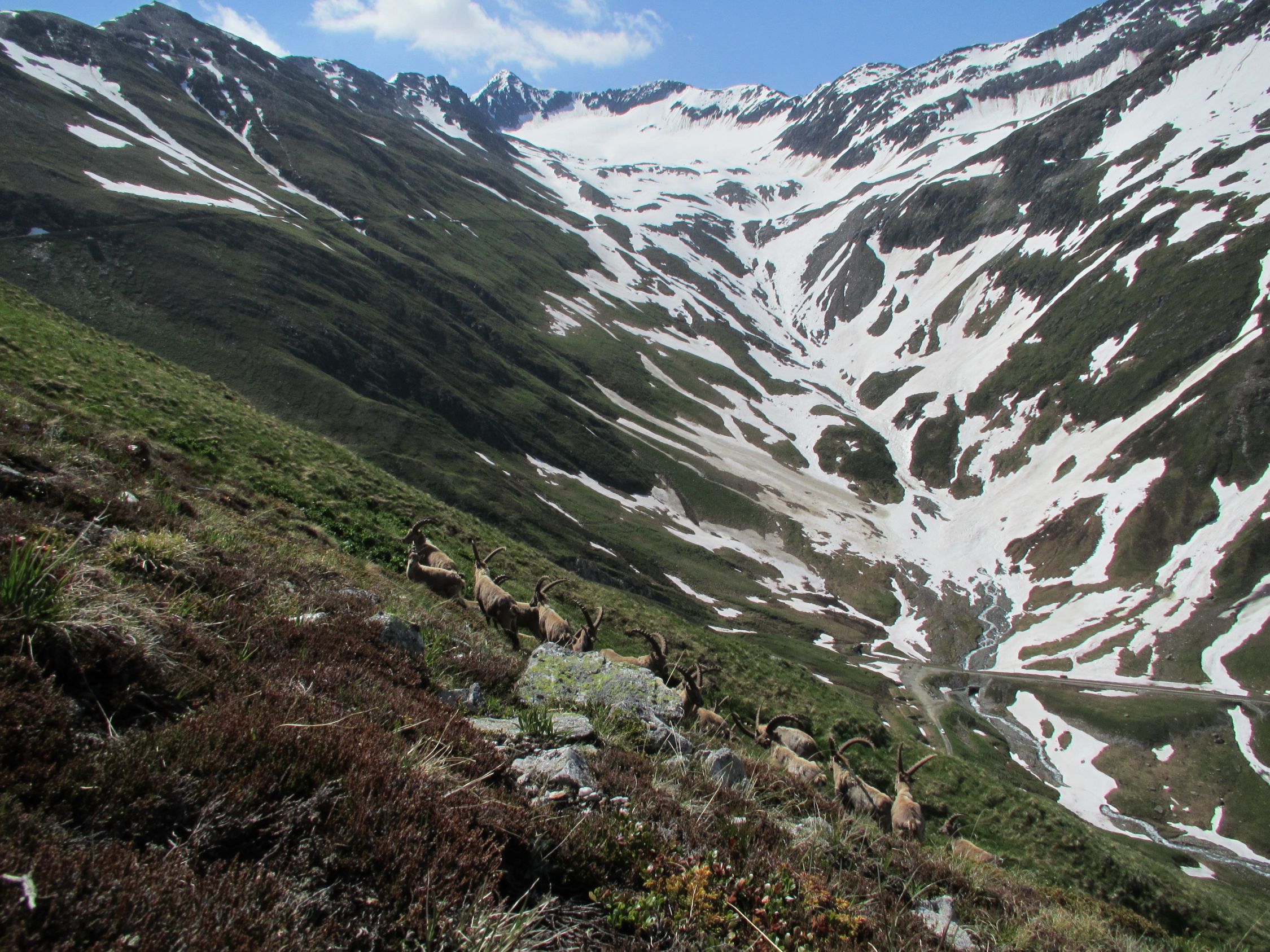 Über den Furkapass, oberhalb Muttbach der Naturstrasse entlang zum Furka Dampfbahn Tunnel. Auf tragender Schneedecke durchs Bachtobel zum Muttgletscher hinauf. Der Muttbach hat sich an einigen Stellen vom Schnee befreit, desshalb sind die unterspülten Brücken mit Vorsicht zu überschreiten. In der Mitte des Steilhangs Skidepot erstellt und mit Steigeisen auf den westlichen Gipfelgrat. Dem Grat folgend auf das Gross Muttenhorn. Herrliches Fotowetter, windstill und mild. In der Abfahrt Sulz al dente auf dem Gletscher, dann aufgeweichter Büsserschnee bis zum Bahngeleise zurück. Am frühen Morgen habe ich einige Steinböcke auf der Furkastrasse gesehen, auf dem Heimweg habe ich ihnen einen freundschaftlichen Besuch abgestattet.