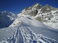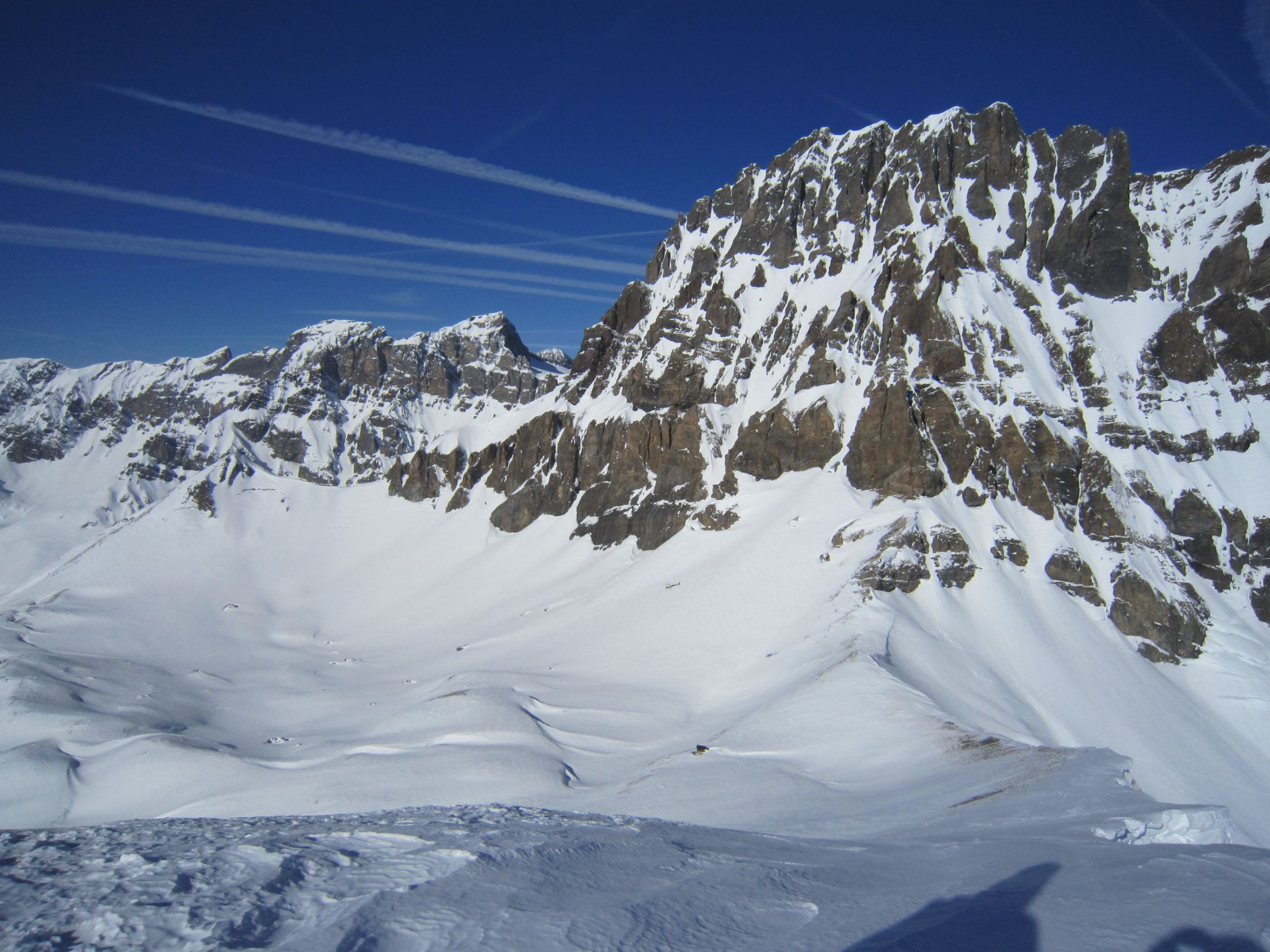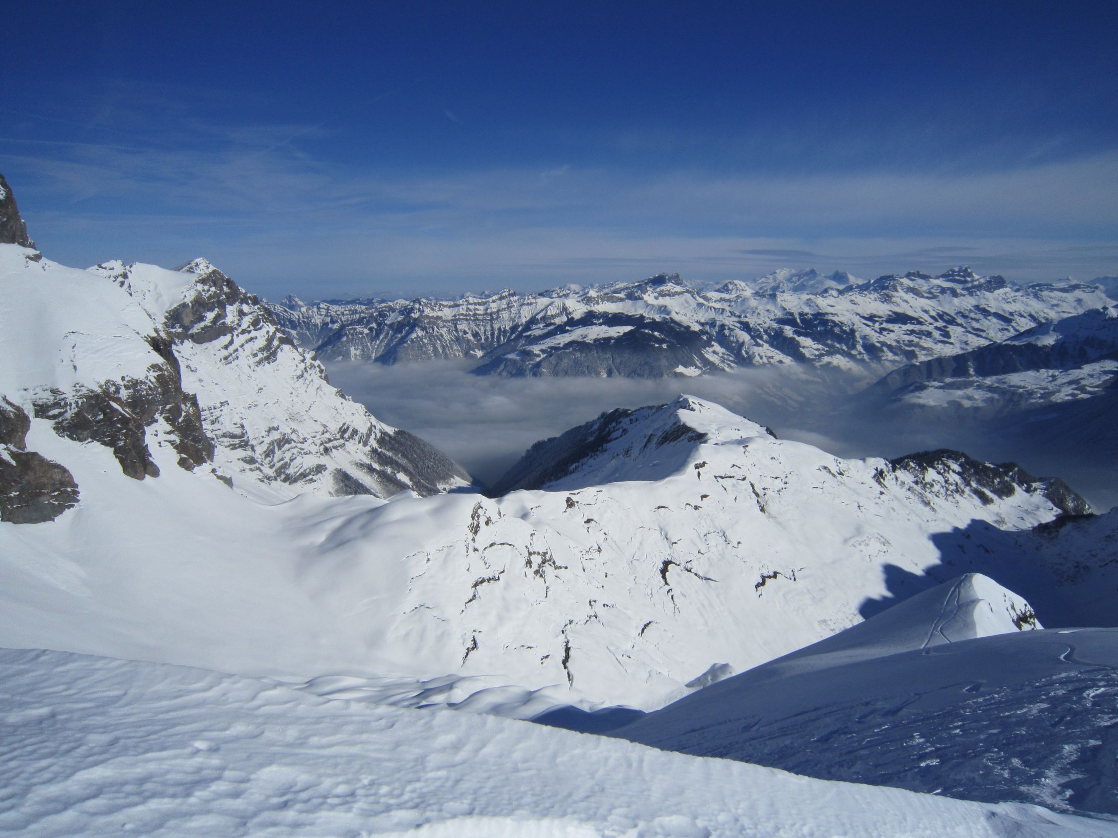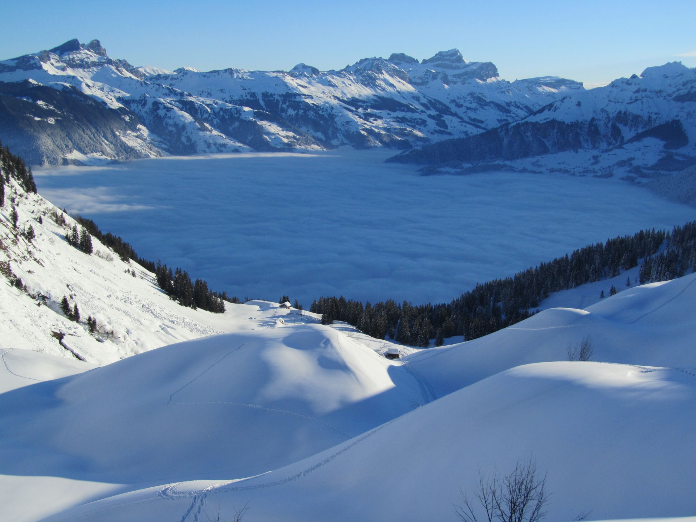 Der Urner Talboden lag im Nebel aber schon auf Brüsti waren wir über den Wolken. Wir stiegen zum Rämseli auf und fuhren in den Kessel von Chulm ab. Die Hänge auf den Geissrüggen sind steil und wir kamen trotz der Kälte ins Schwitzen. Vom Geissrüggen Richtung Waldnacht zeigten sich gewaltige Fischmäuler in denen eine Gämse nach Futter suchte. Die Traverse zum Angistock war wie meistens vereist. Wir spurten unter dem Brunni und Blackenstock die lange Querung zum Surenenpass. Grosse Wächten grüssten dem Gipfelgrat entlang zum Eggenmandli. Am Gipfel ziemlich windig und kalt, kein Ort zum verweilen. Wir fuhren über den steilen Nordosthang Richtung Waldnacht ab. Herrlicher Pulverschnee und viel Platz für eigene Spuren, ja was will man noch mehr? Kurzer Aufstieg mit wenig Höhenmeter von Waldnacht zur Brüstiabfahrt. Die Abfahrt von Brüsti nach Attinghausen ist zwar schon ziemlich verfahren aber immer noch gut machbar.