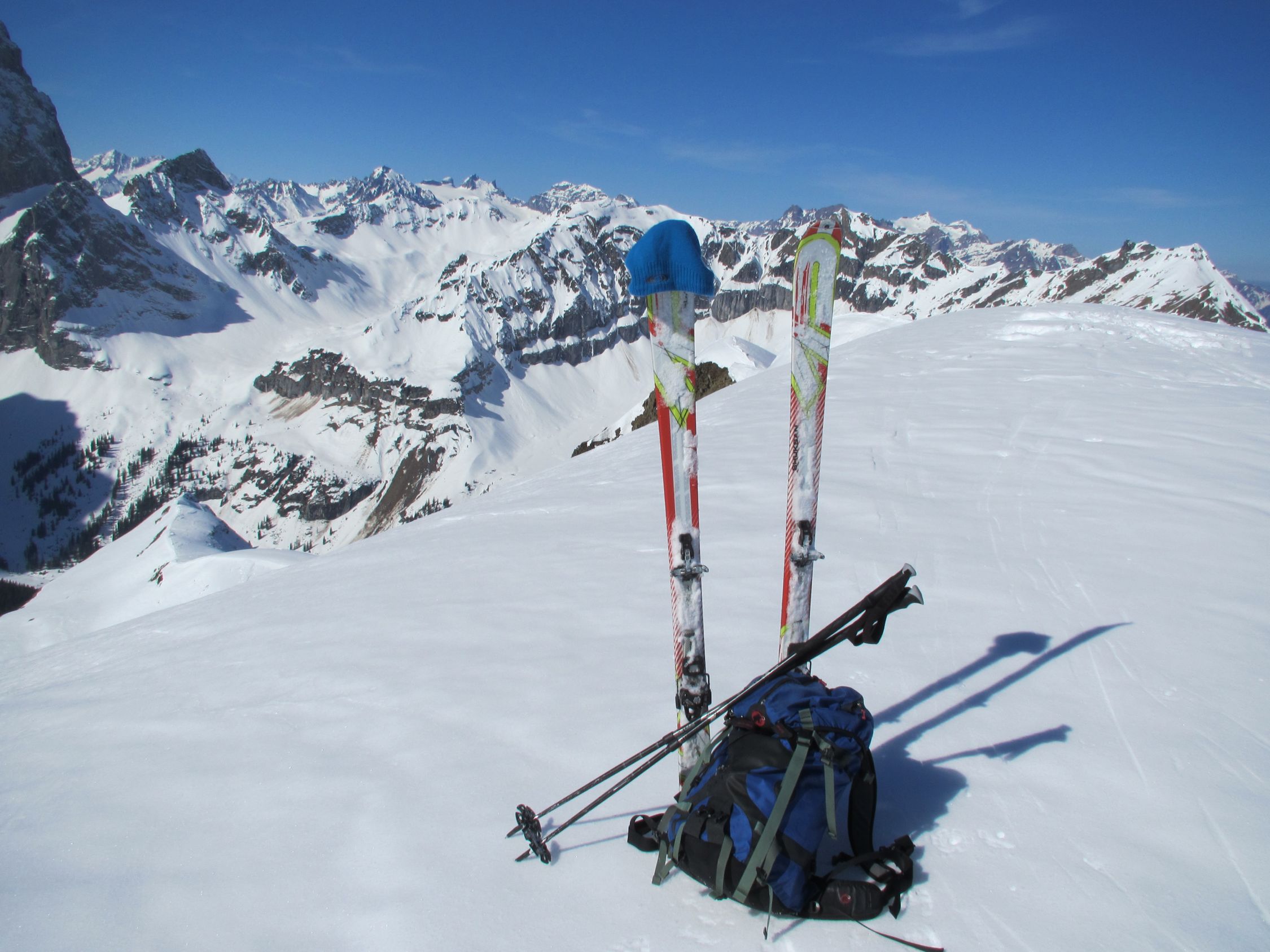 Start durchs Brunnital just bei Tagesanbruch. Bei Rüti durch den Grosswald zur Alpstrasse, ihr entlang nach Nider Lammerbach. Weiter unter das Eiscouloir, dann links abgedreht und auf gefrorenem Schnee dem Sommerweg entlang steil nach Ober Lammerbach. Neben dem Chüewäspen bis unter die Felsen des Wäspen hinauf. Leicht abgefahren, dann auf der ruppigen (Lawinenschnee) Gipfelflanke zum Wäspen hinauf. Milder, wolkenloser Frühlingstag mit guter Fernsicht. Abfahrt unter den Wäspen, von dort Richtung Chüewäspen traversiert. Auf wunderschönen Sulzschneehängen auf Ober Lammerbach abgefahren. Der Steilhang zum Ruchenhüttli hinab konnte noch nicht richtig aufweichen, da gings flott dahin. Ab Nider Lammerbach, durch den Grosswald bis zurück nach Rütti wieder schöner Frühlingsschnee.