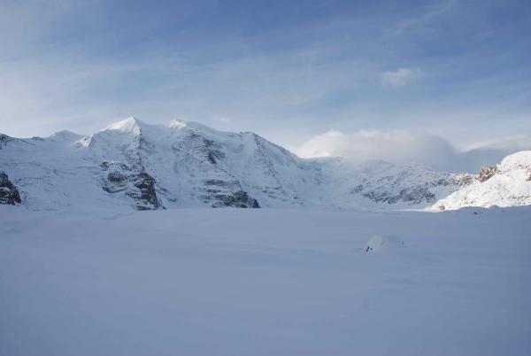 Querung Persgletscher: Spalten noch nicht vollständig zugedeckt, Brücken sehr kritisch beurteilen. Mit einem grossen Bogen bis fast unter dem Ost-Pfeiler des Palü kann man die meisten Spälte umgehen.