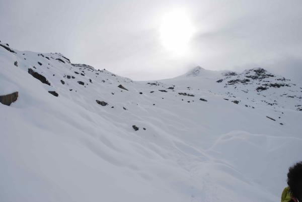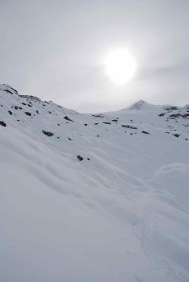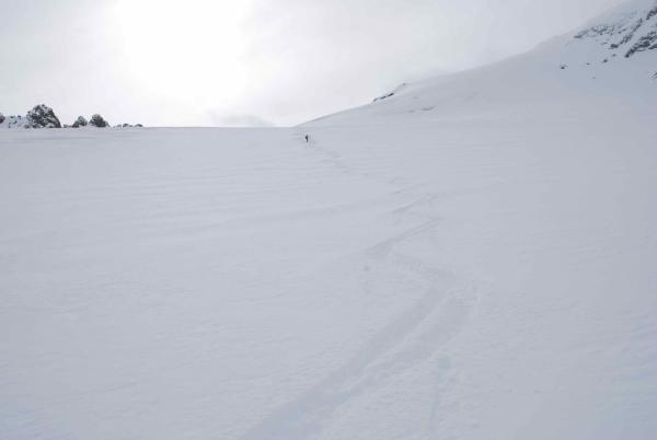 Steilhang auf der Moräne unter dem Piz Trovat stellenweise heikel: kleine Rutsche mit Ski abgelöst. Verwehungen auf dem Persgletscher beobachtet: Wind von der Fuorcla Bellavista.