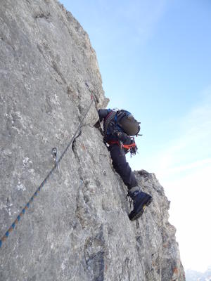 Meiner Meinung nach hat die Tour eher Hochtouren- als Klettertourencharakter, da die Kletterstellen meist eher kurz sind, dazwischen längere Passagen mit Gehgehlände vorhanden sind und die Felsqualität oftmals auch nicht ganz einwandfrei ist.
