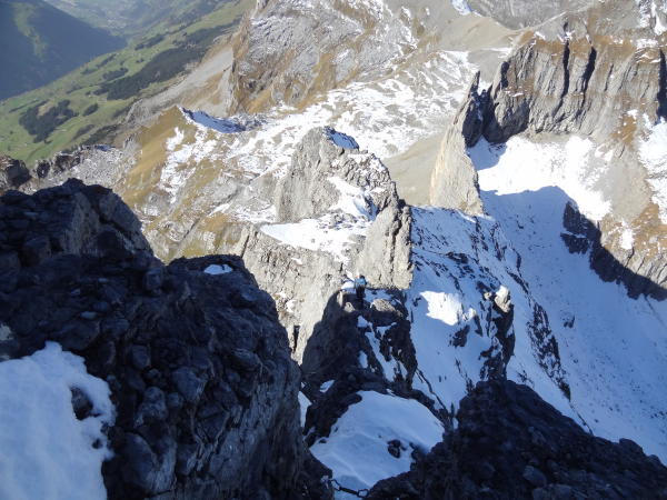 Auf der Nordseite des Grates liegt etwas Schnee, südseitig ist alles trocken. Der Schnee stört jedoch nicht gross, da die Kletterstellen meist schneefrei sind (einziger Nachteil sind dann die nassen Schuhsohlen, welche die Kletterei etwas interessanter gestalten.