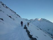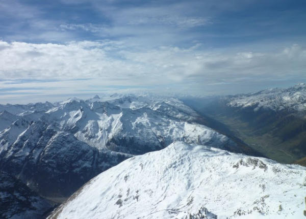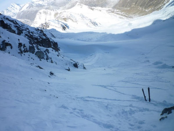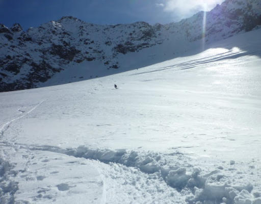 durchgängig Schnee bis zum Gipfel. Militärstrasse mit 10-23 cm Schnee bedeckt, d.h. schieben ab der Passhöhe möglich. Morgens firn und Bruchharsch, Auf dem Gletscher traumhafter Pulver. Unterhalb der Nordflanke Skidepot gemacht. Nordflanke und Grad mit ausreichend Schnee. Gipfel mit leichtem Restföhn. Im Lee auf der Sonnenseite traumhaft.