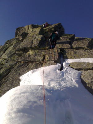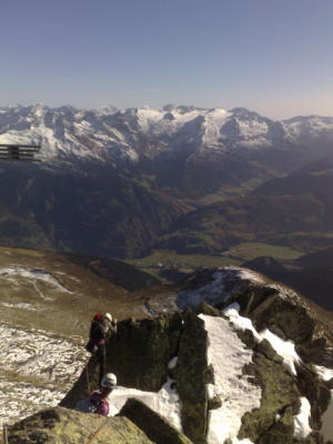 Grat und Scharten trocken. N-seitig liegt ein rechter Haufen Schnee, gegen einen halben Meter.