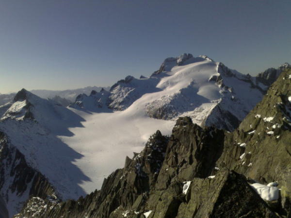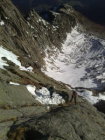 Unten landet man jedoch auf einem etwas steilen Schneefeld, welches im Sommer ausgeapert und möglicherweise hart ist. Vorsicht auch vor dem Bergschrund!