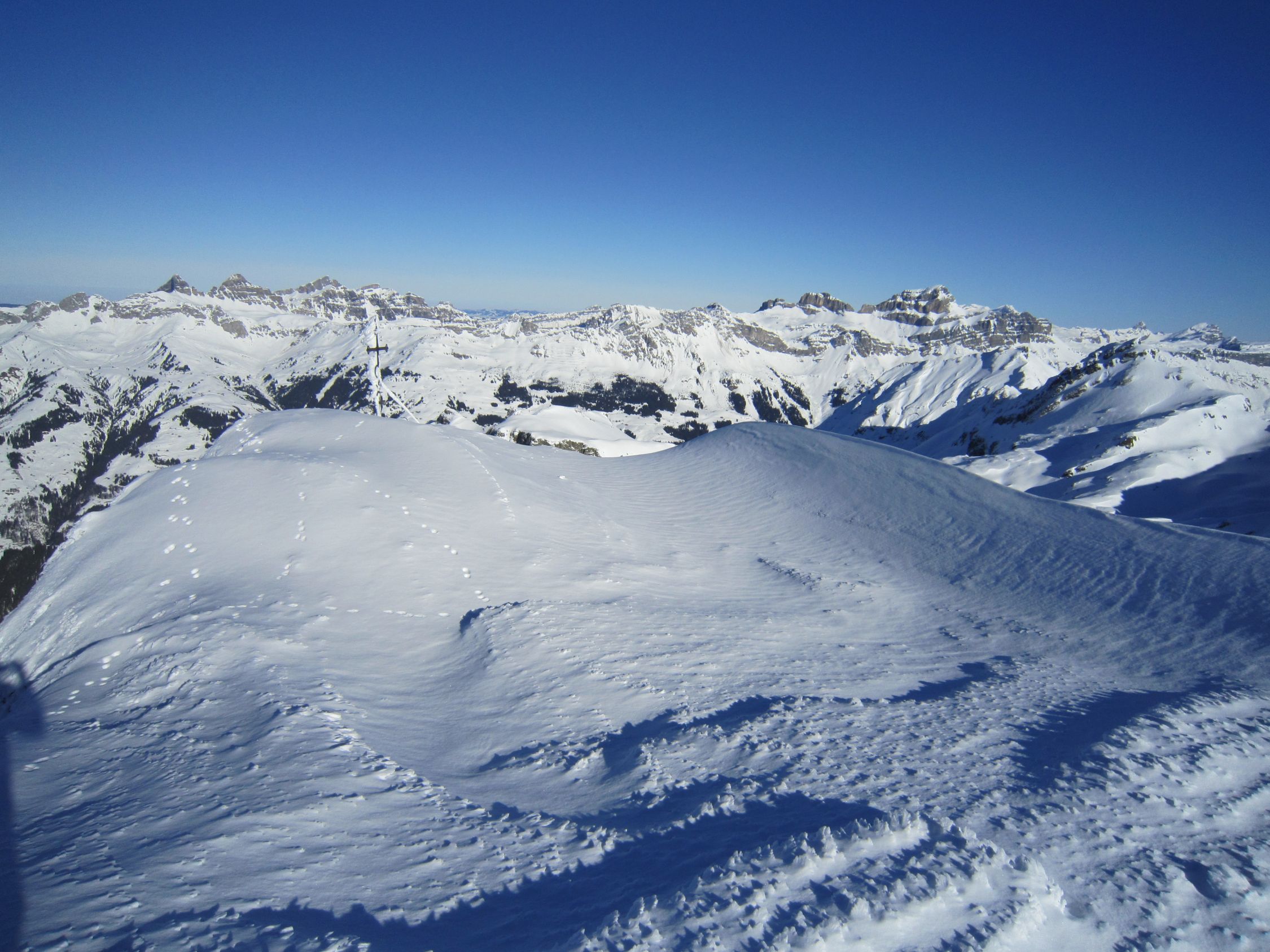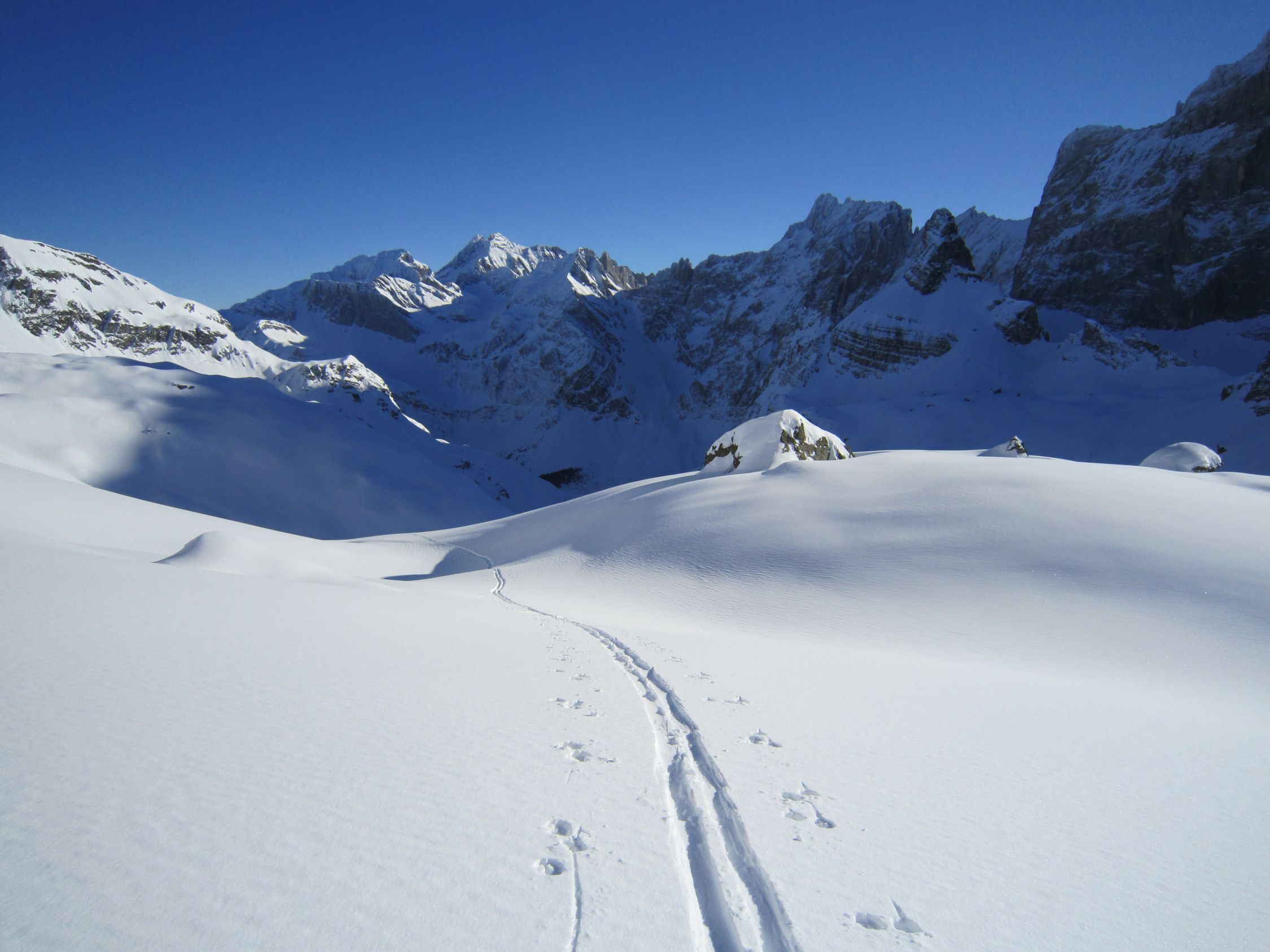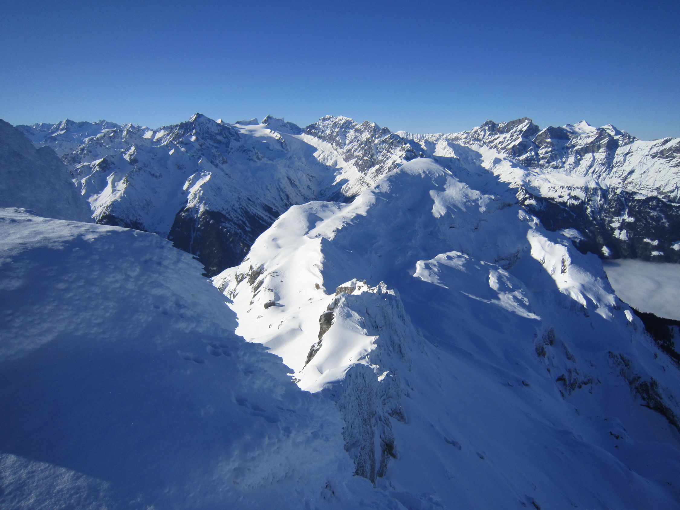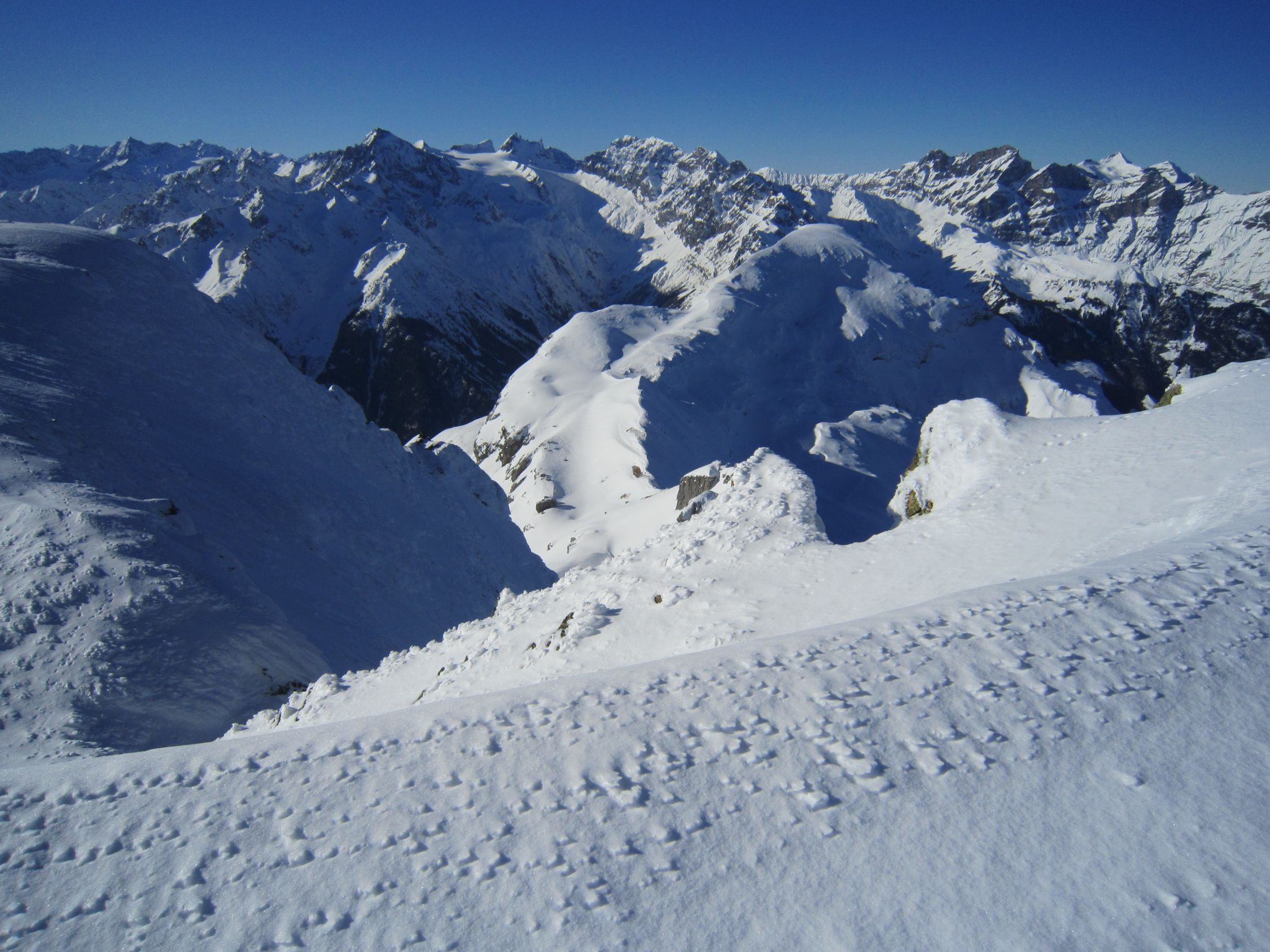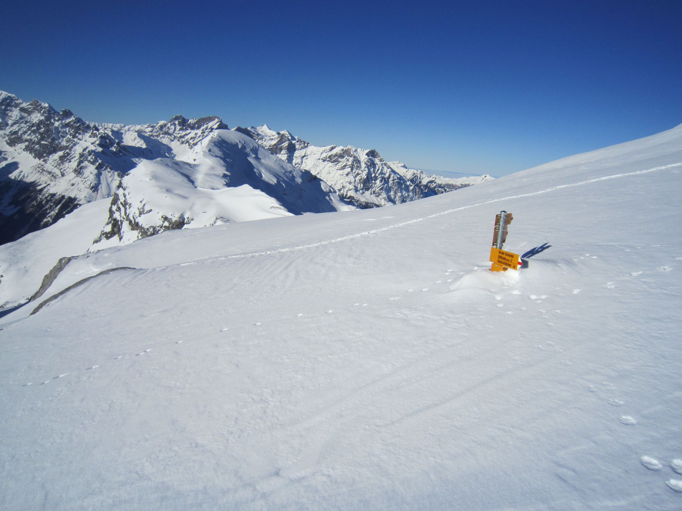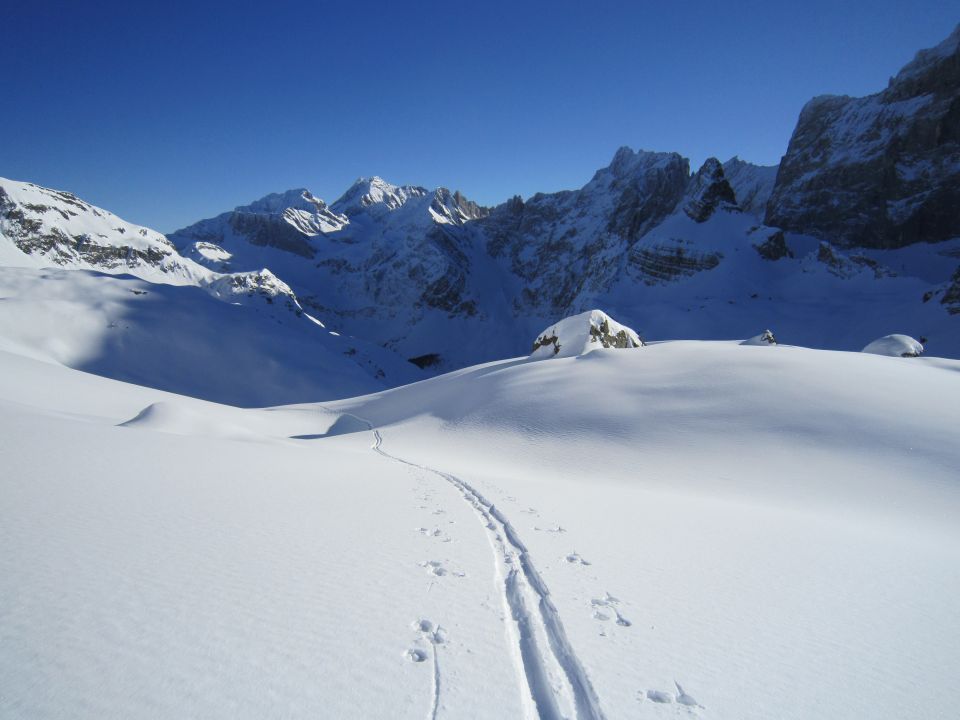 Mit dem Postauto nach Unterschächen. Skis bis zum Parkplatz Bad getragen. Durchs tief verschneite Brunnital nach Brunni. Via Chärschelenwald ins Griesstal, die Spur zum Stich war vom Winde verweht. Auf dem Hoch Fulen kalt und windig, doch beste Fernsicht. Nur gerade drei Spuren In der Abfahrt durchs Griesstal, also Platz im Überfluss. Rechts über Pfaffen, auf den unverfahrenen Hängen, zur Brunnialp abgefahren. Auf der Waldstrasse nach U-schächen zurück