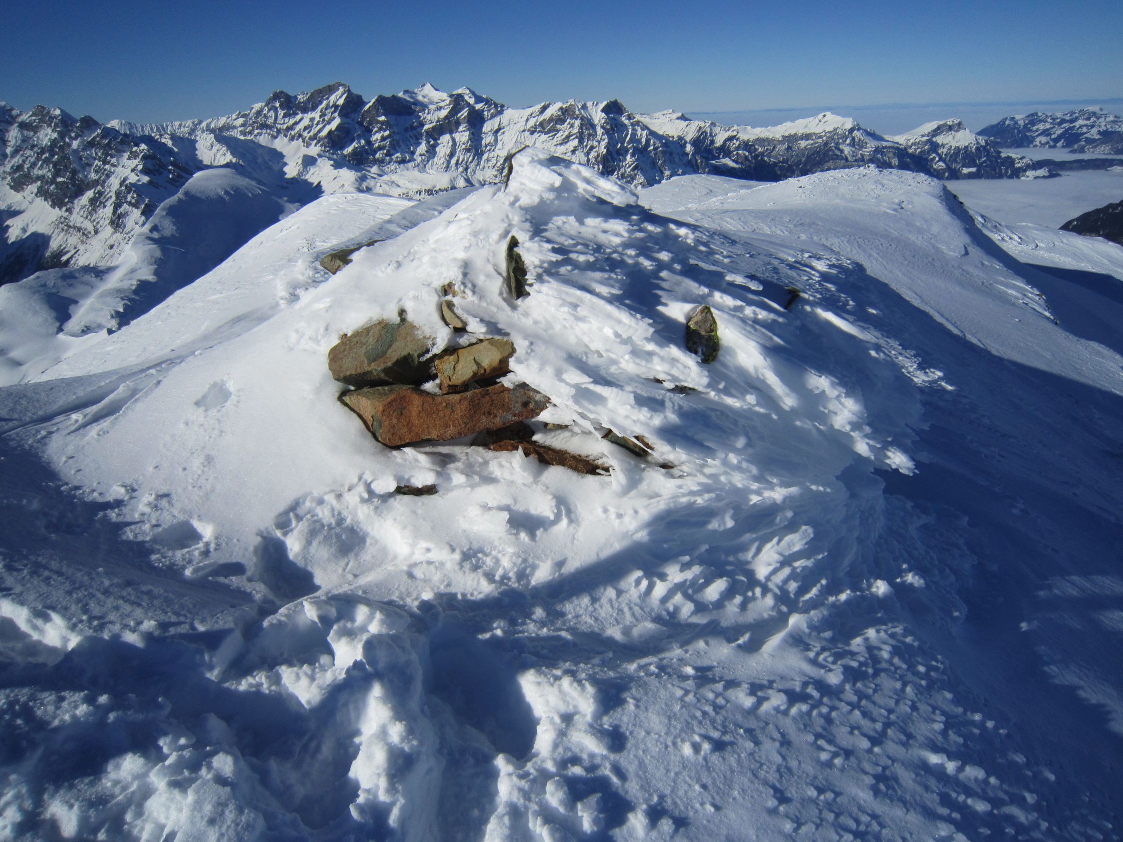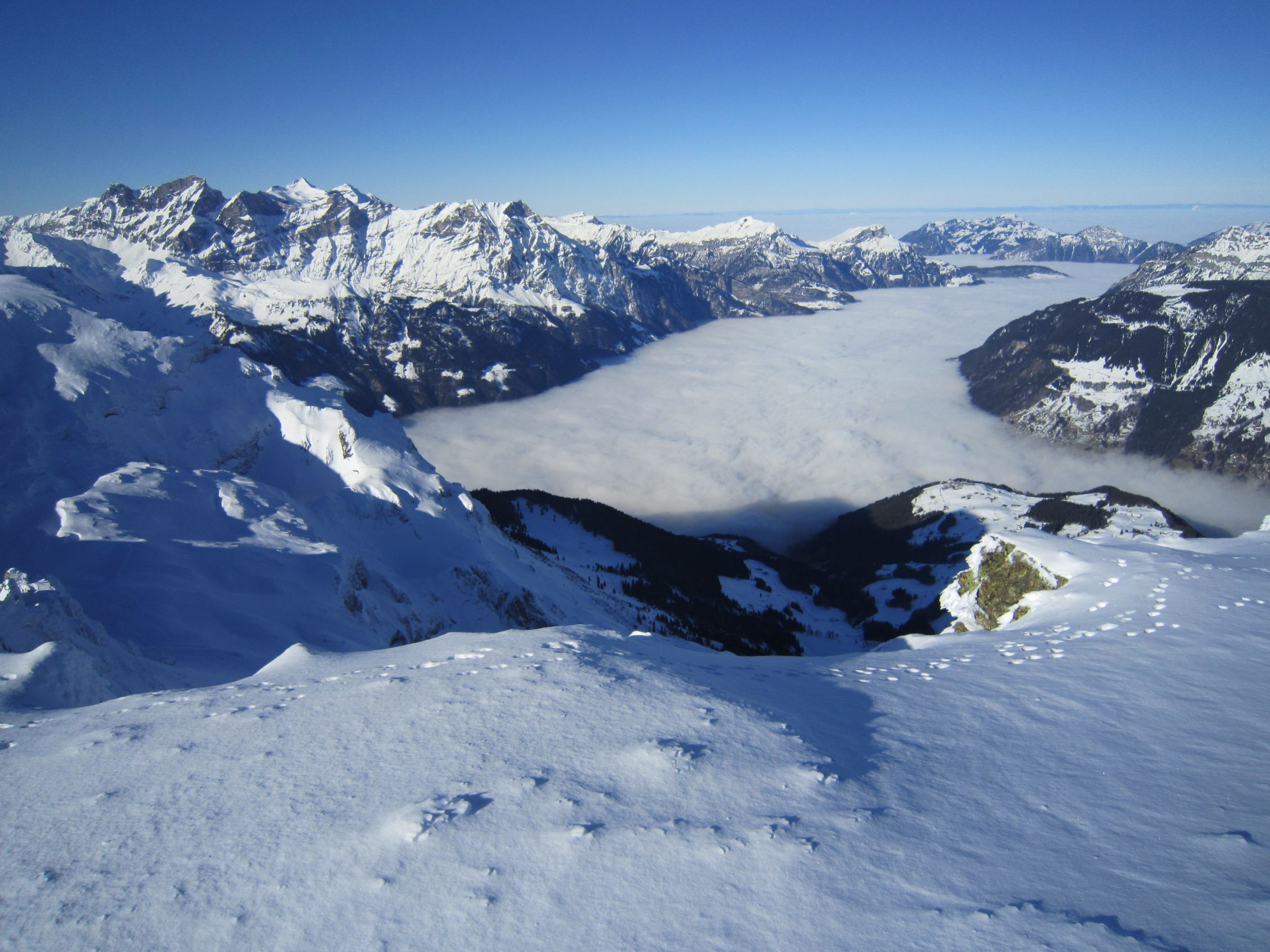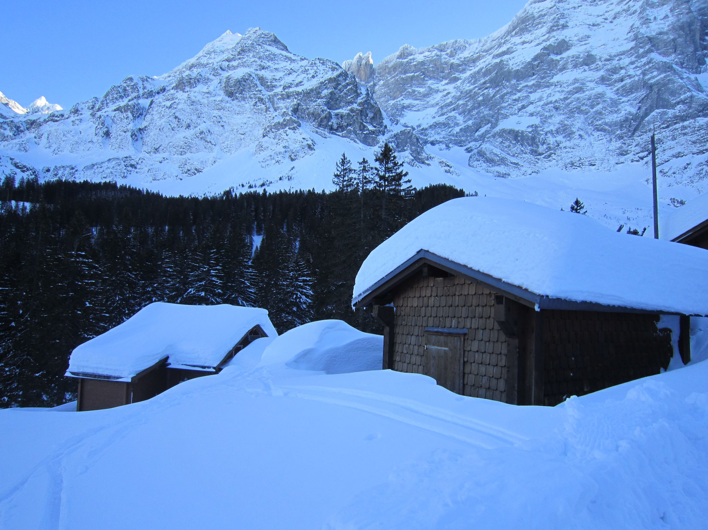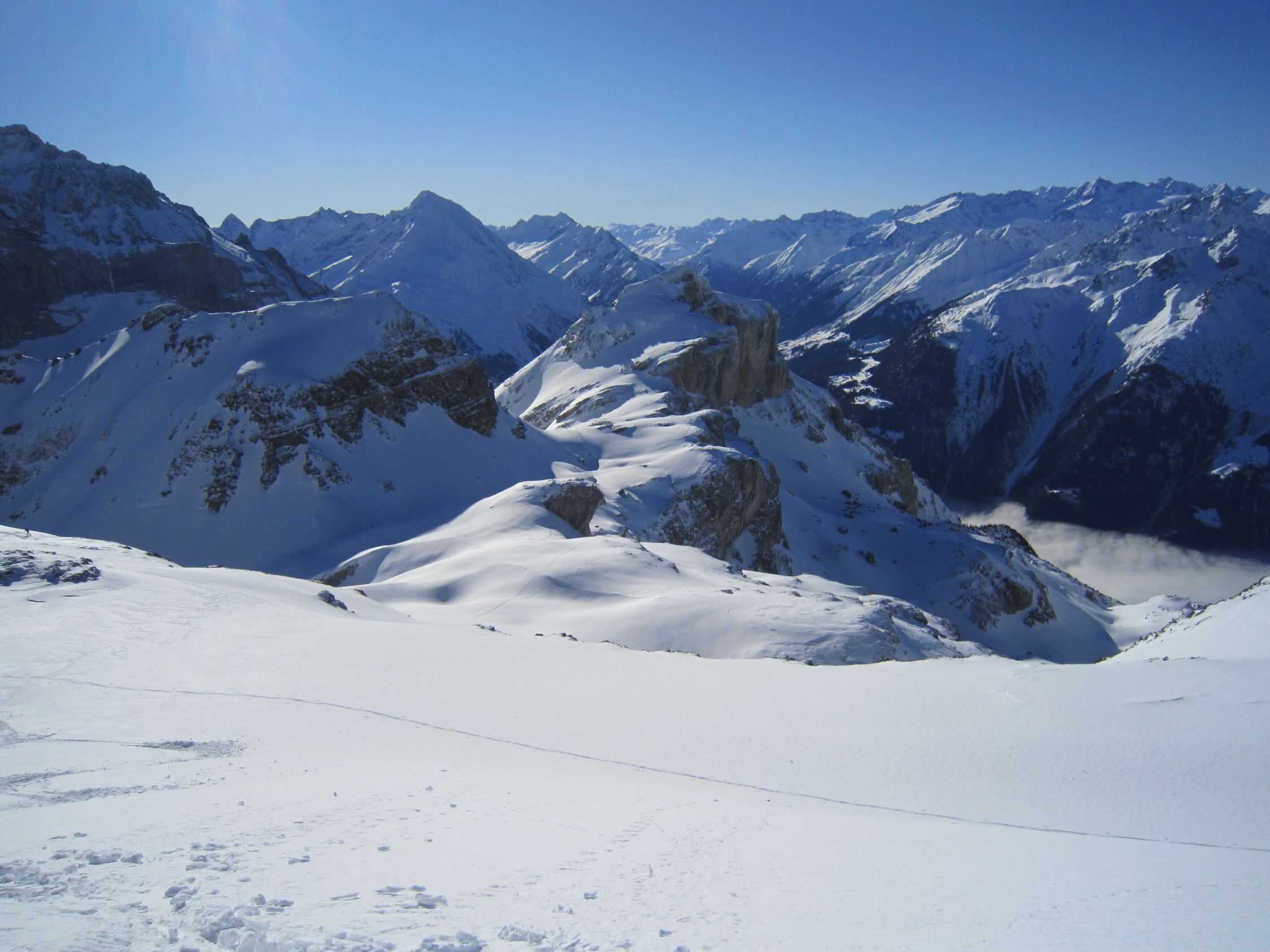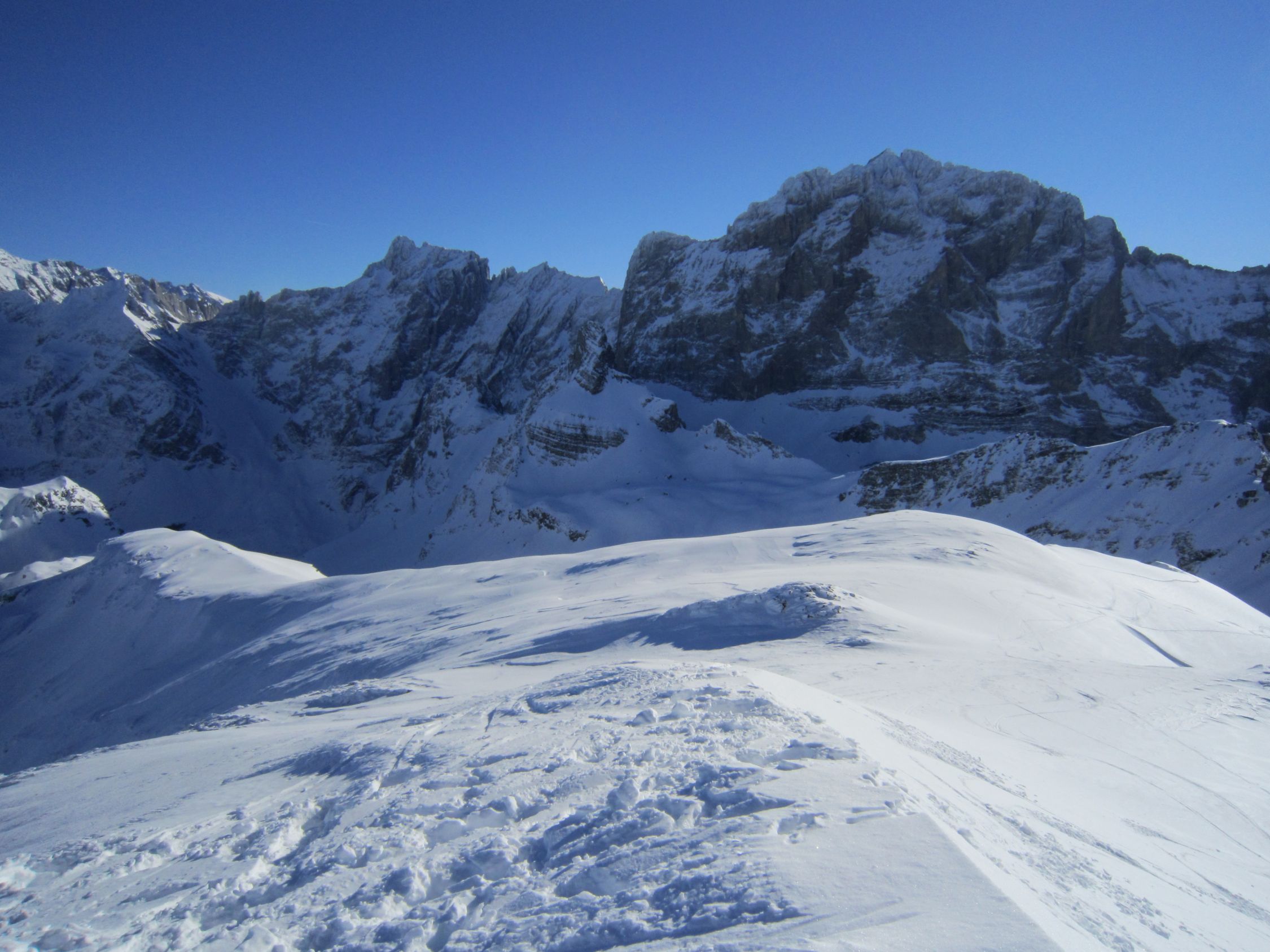 Mit dem Postauto nach Unterschächen. Skis bis zum Parkplatz Bad getragen. Durchs tief verschneite Brunnital nach Brunni. Via Chärschelenwald ins Griesstal, die Spur zum Stich war vom Winde verweht. Auf dem Hoch Fulen kalt und windig, doch beste Fernsicht. Nur gerade drei Spuren In der Abfahrt durchs Griesstal, also Platz im Überfluss. Rechts über Pfaffen, auf den unverfahrenen Hängen, zur Brunnialp abgefahren. Auf der Waldstrasse nach U-schächen zurück