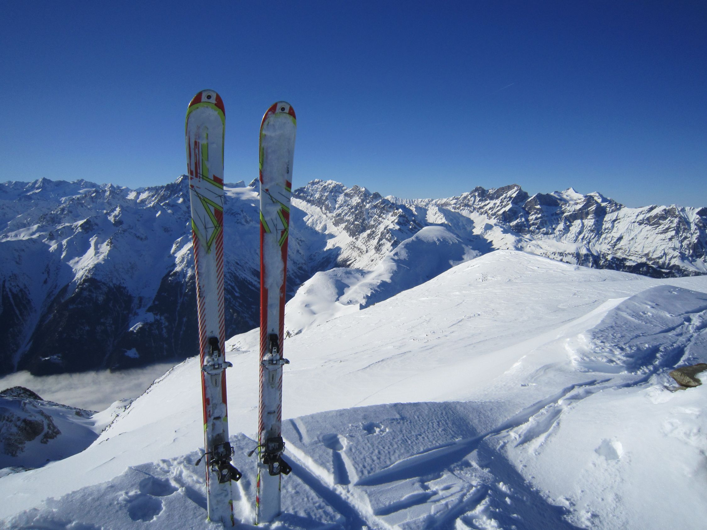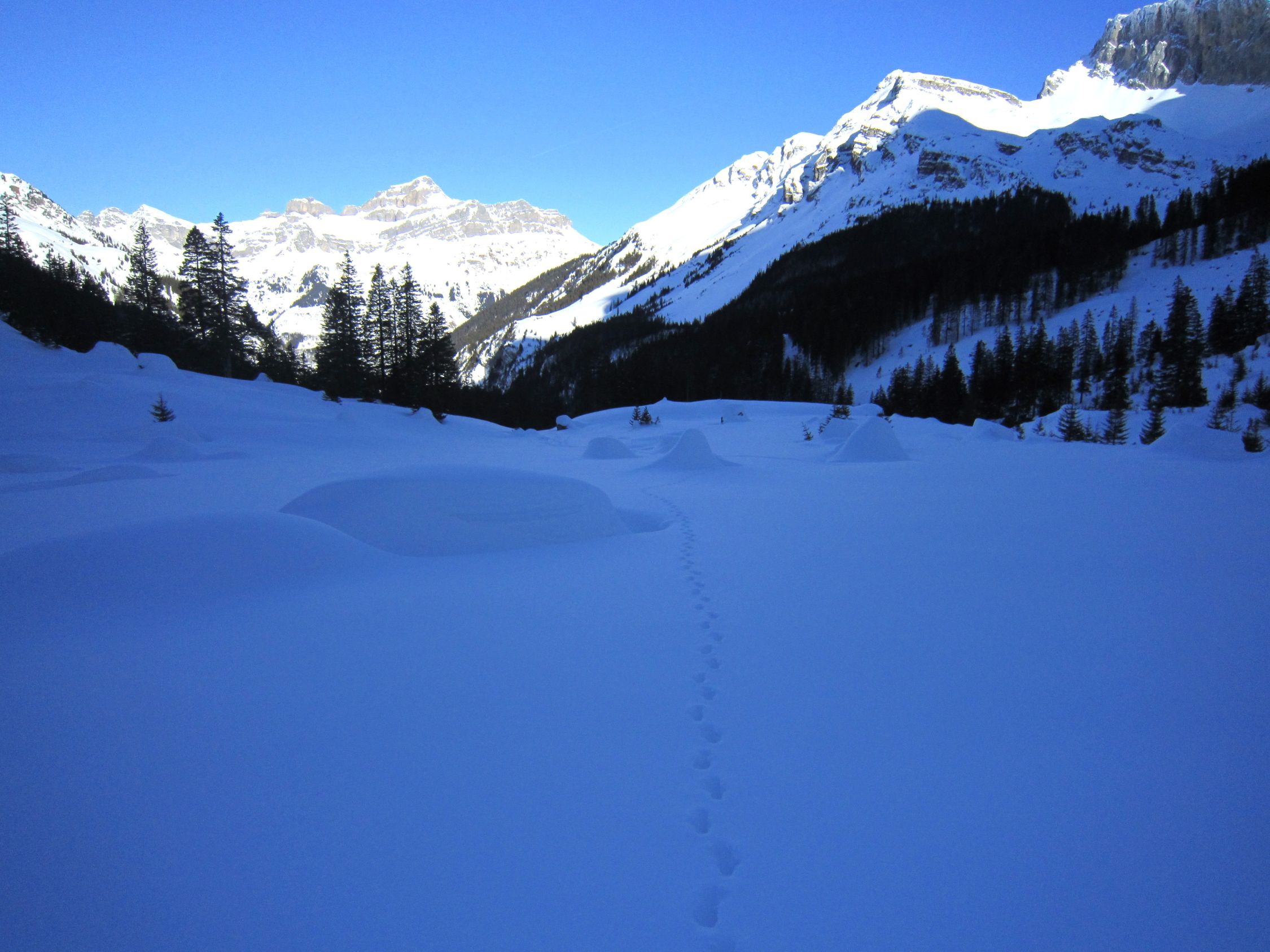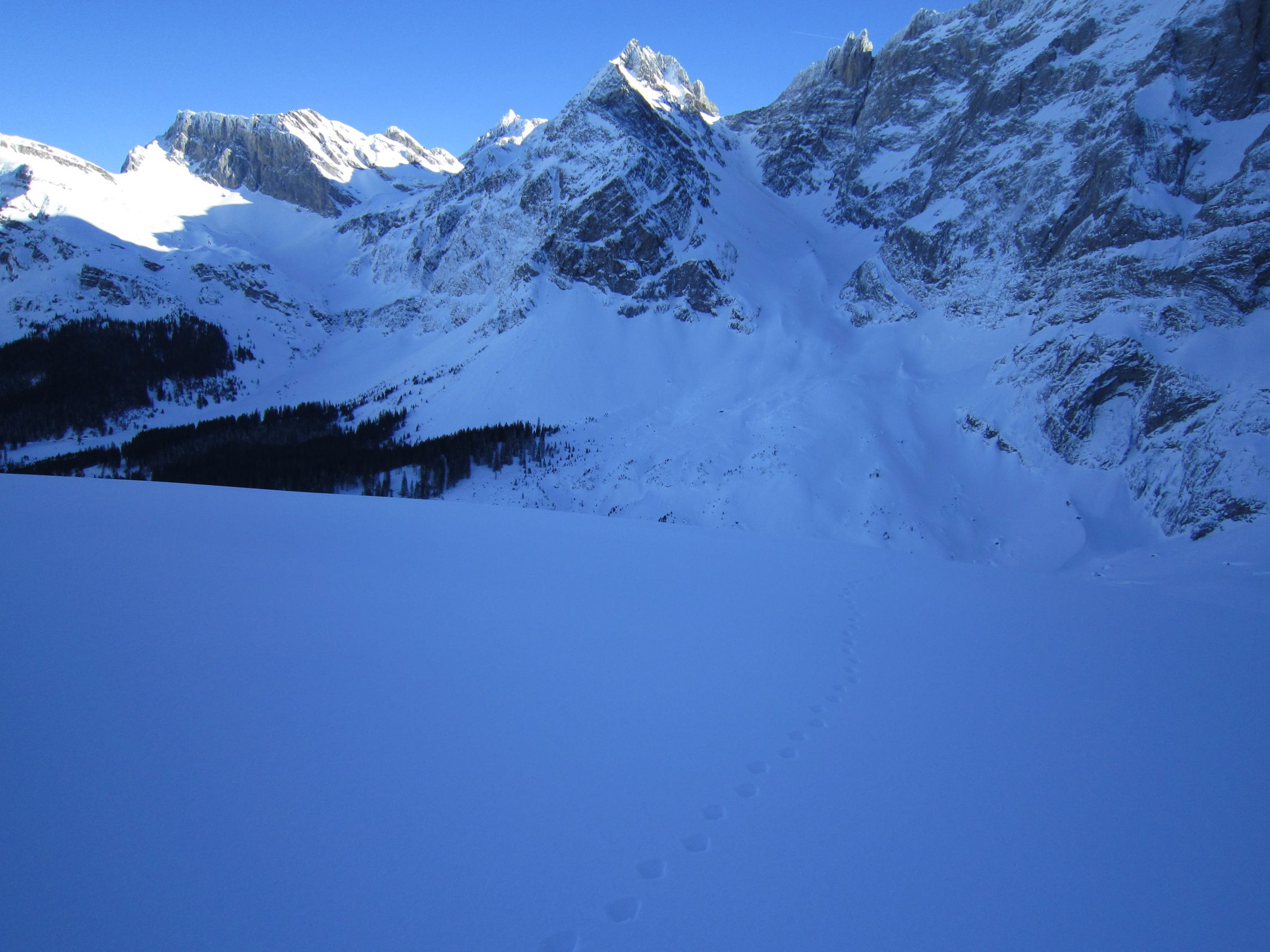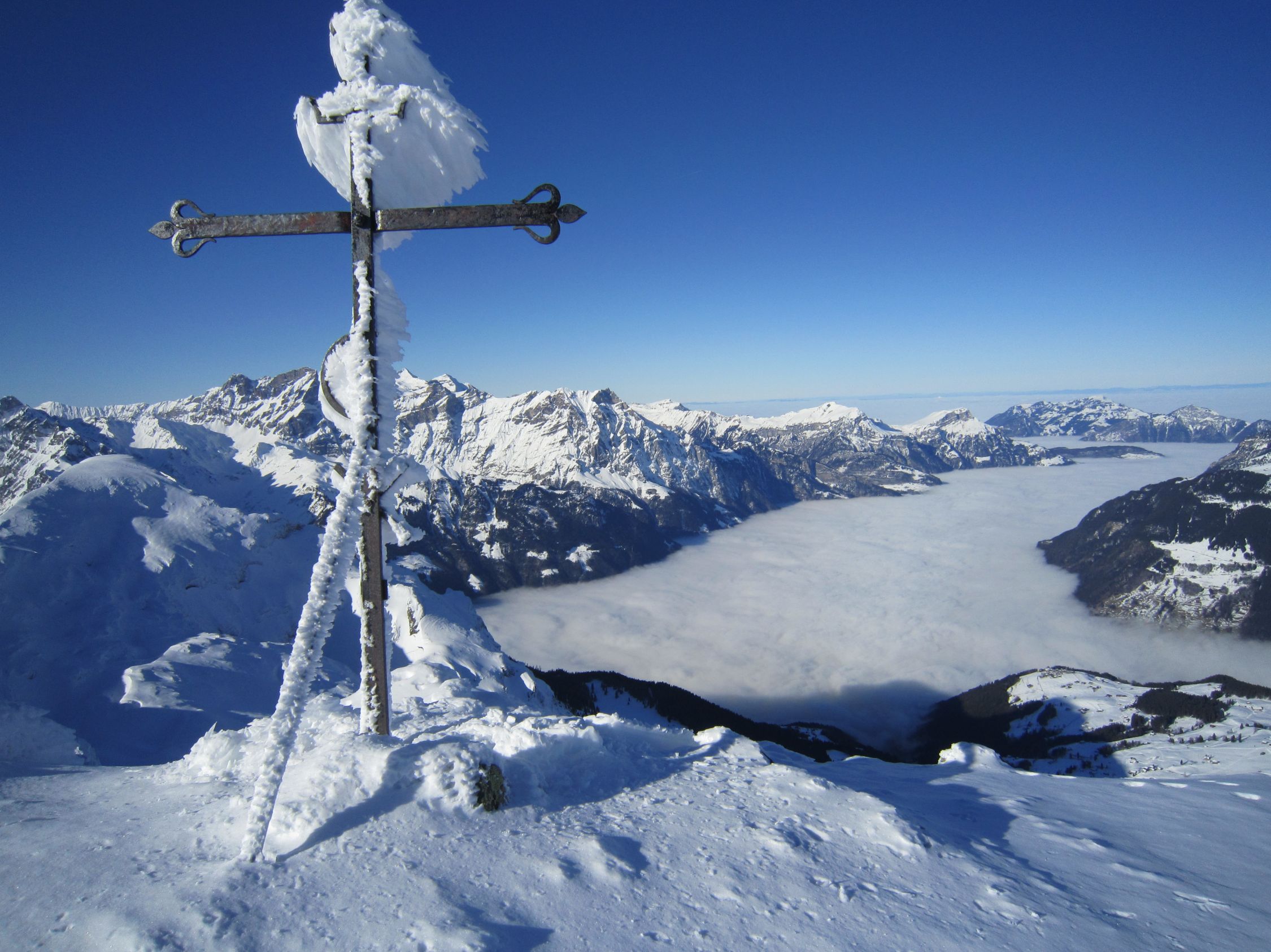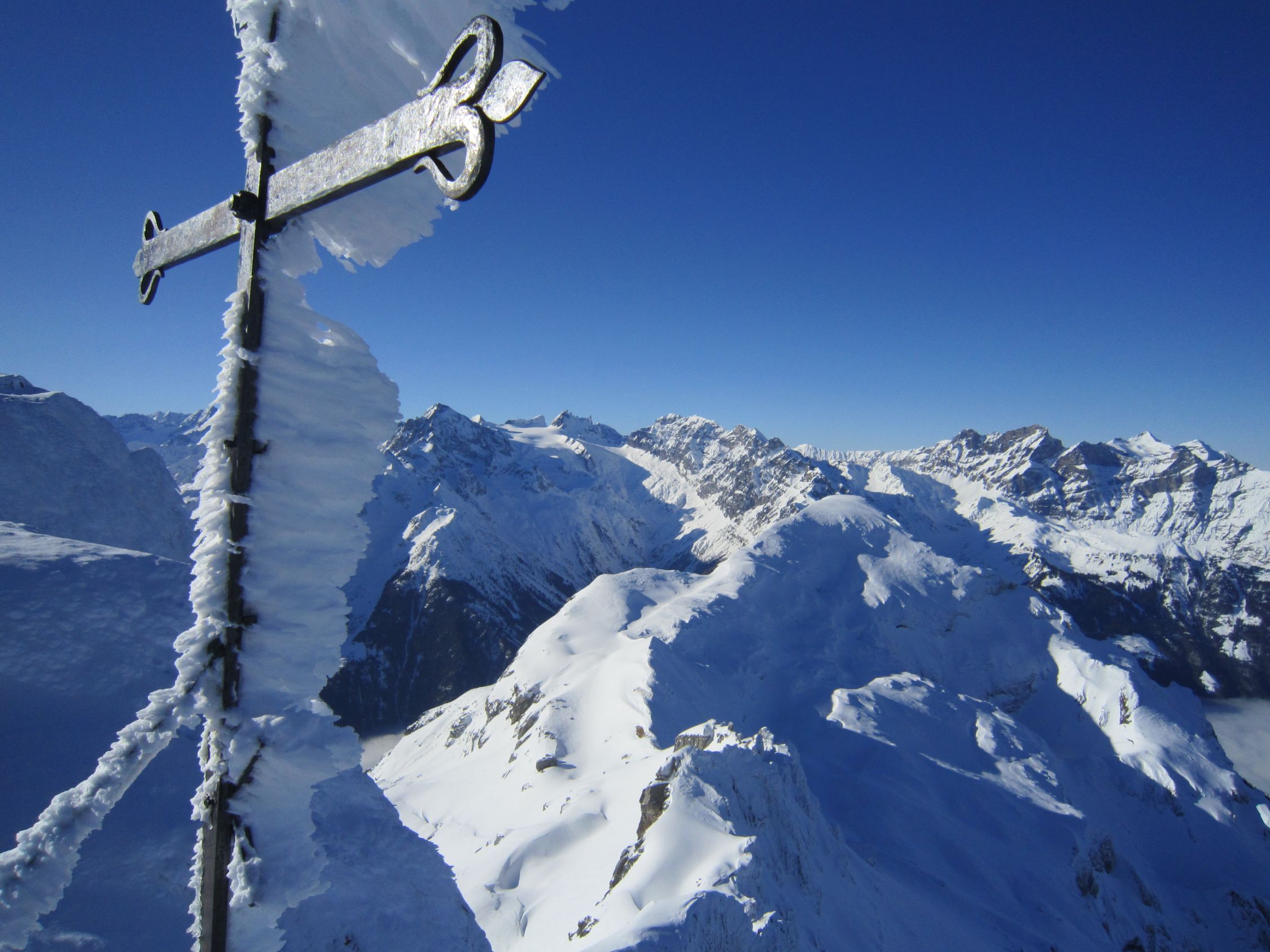 Mit dem Postauto nach Unterschächen. Skis bis zum Parkplatz Bad getragen. Durchs tief verschneite Brunnital nach Brunni. Via Chärschelenwald ins Griesstal, die Spur zum Stich war vom Winde verweht. Auf dem Hoch Fulen kalt und windig, doch beste Fernsicht. Nur gerade drei Spuren In der Abfahrt durchs Griesstal, also Platz im Überfluss. Rechts über Pfaffen, auf den unverfahrenen Hängen, zur Brunnialp abgefahren. Auf der Waldstrasse nach U-schächen zurück