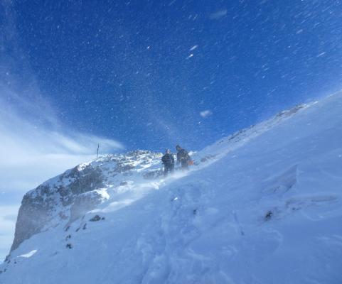 In der Wand angenehm warm, und leichter Wind. Der Abstieg ist bis zum Beginn des Gamstobels sehr winterlich, ca.20 cm Schnee.