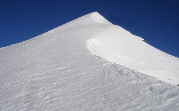 «Alter Neuschnee» ab dem Anungletscher. Im Aufstieg bis auf den Gipfel hart gefroren (griffig). Felsen auf dem Grat zum Teil heikel zum Klettern (Pulver auf der Schattenseite). Im Abstieg im oberen Teil Sulzschnee, im unteren Teil Schnee weich.