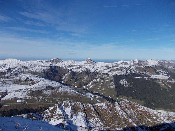 Der Föhn sorgte für angenehme Temperaturen und für eine phänomenale Fernsicht. Dem Schnee hingegen machte er bereits zusehends den Garaus. Auf den Graten und auf dem Gipfel wehte nur ein laues Lüftchen, von einem Föhnsturm waren wir dort oben weit entfernt.