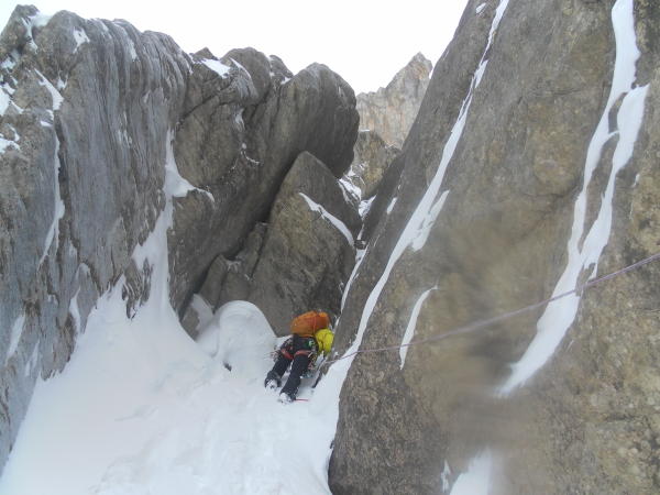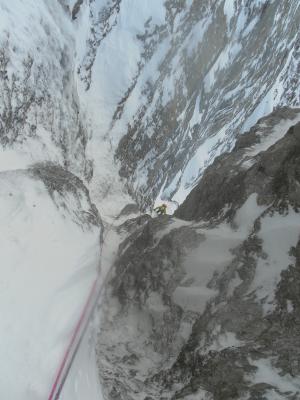 - Schneeverhältnisse: Ich habe selten derart ätzenden Schnee in einer Nordwand erlebt. Auf den diversen Flachstücken (von denen es nicht wenige gibt), liegt metertiefer, unverfestigter Pulver, so dass man zeitweise bis zur Brust darin versinkt.