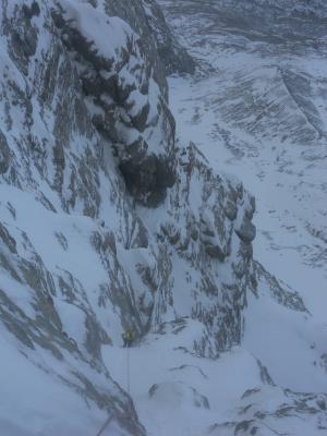 Grundsätzlich sind die Eisverhältnisse wohl nicht so schlecht. Wir sind bis zur 7. SL gekommen, dort hatte es ok viel Eis. Wobei die Qualität allerdings lausig ist, oftmals total spröde und schneedurchsetzt, und nur unregelmässig gut genug zum Schrauben. Auf den ersten vier SL hat es kein Eis, in der 5. SL (4a) nur eine dünne Glasur.