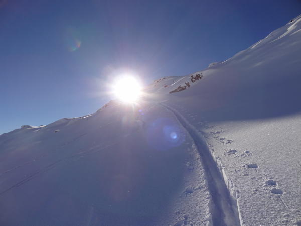 Erstaunlich gut. Es hat zwar noch nicht Schnee im Überfluss, aber mit etwas offenen Augen kann man den Steinen gut ausweichen. Und die Abfahrt war heute wirklich ein Vergnügen. Praktisch überall bis zu 30 cm super Pulver. Wir sind zuerst vom Gipfel nach südosten in Richtung Val Maighels abgefahren. Auf ca. 2400 m haben wir wieder angefellt und sind nochmals Richtung Gipfel hoch (war so geplant) um dann über die Aufstiegsroute abzufahren.