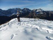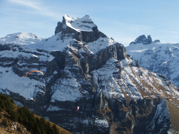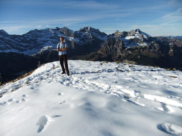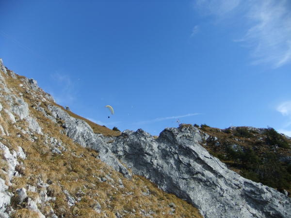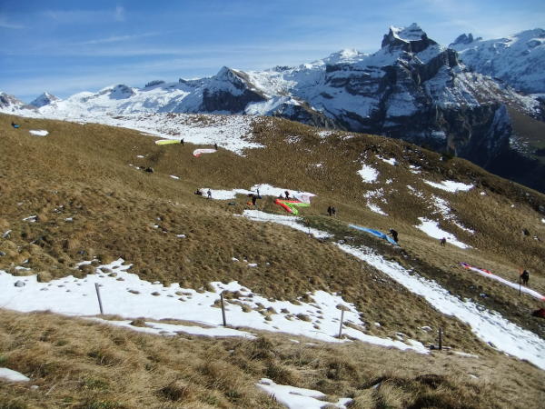 Starke Thermik. Ideales Flugwetter. Bestimmt über 200 Gleitschirmflieger heute mittag hier gesehen. Mittagsrast im T-Shirt im Schnee auf dem Gipfel.