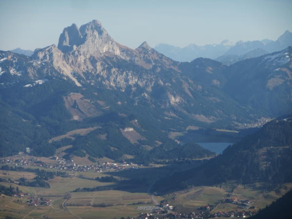 Blicke nach Süden auf Hochvogel, nach Osten auf: die Vilser Gruppe mit Großer Schlicke, die Tannheimer Berge mit dem Gimpel und Haldensee, sowie auf den Felsgrat zwischen Ponten, Geißhorn und Rauhorn.