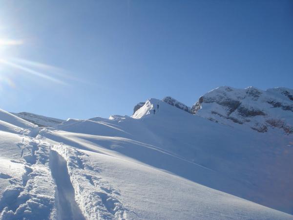 Spurarbeit war hart, weil sich der Schnee noch kaum gesetzt hatte. War mit dem Splittboard unterwegs und hatte gemäss Angaben der Skifahrer bessere Bedingungen. Sprich: Ich konnte in den flacheren Teilstücken noch tolle Schwünge machen, während die Skifahrer zu sehr im Schnee einsanken und deshalb stark gebremst wurden.