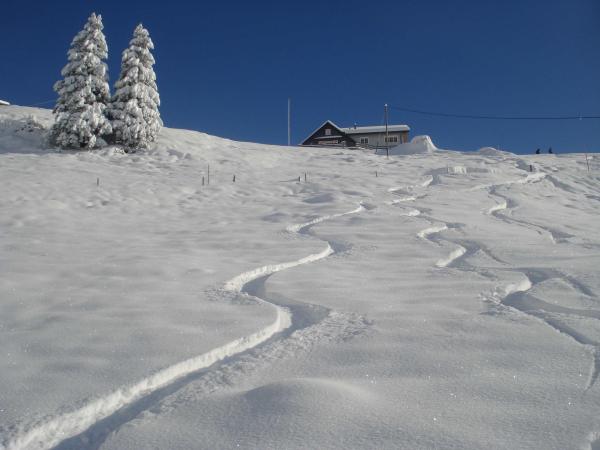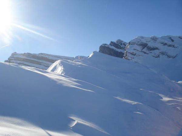 Tolle Tourenverhältnisse. 50 Zentimeter Pulverschnee. Im unteren Bereich ohne Unterlage. Ab Druesberghütte hat es teilweise auf eine bestehende Schneedecke geschneit. Dennoch liegt noch nicht so viel Schnee. Steinkontakt kann mit geschickter Routenwahl bei der Abfahrt weitgehend vermieden werden.