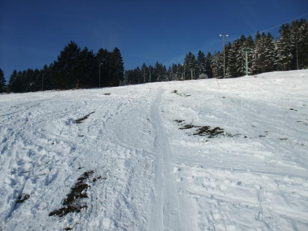 In Nods auf der Piste dünne aber ausreichende Unterlage. Im Wald auf dem Sommerwanderweg Ok bis zur Antenne. Abfahrt oben leicht gedeckelt mit ca. 40 cm Triebschnee. Auf der Schneise dann schon festgefahren und daher OK. Kein Steinkontakt. Super Wetter bis Mittag. Dann kroch der Nebel hoch.