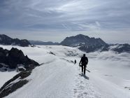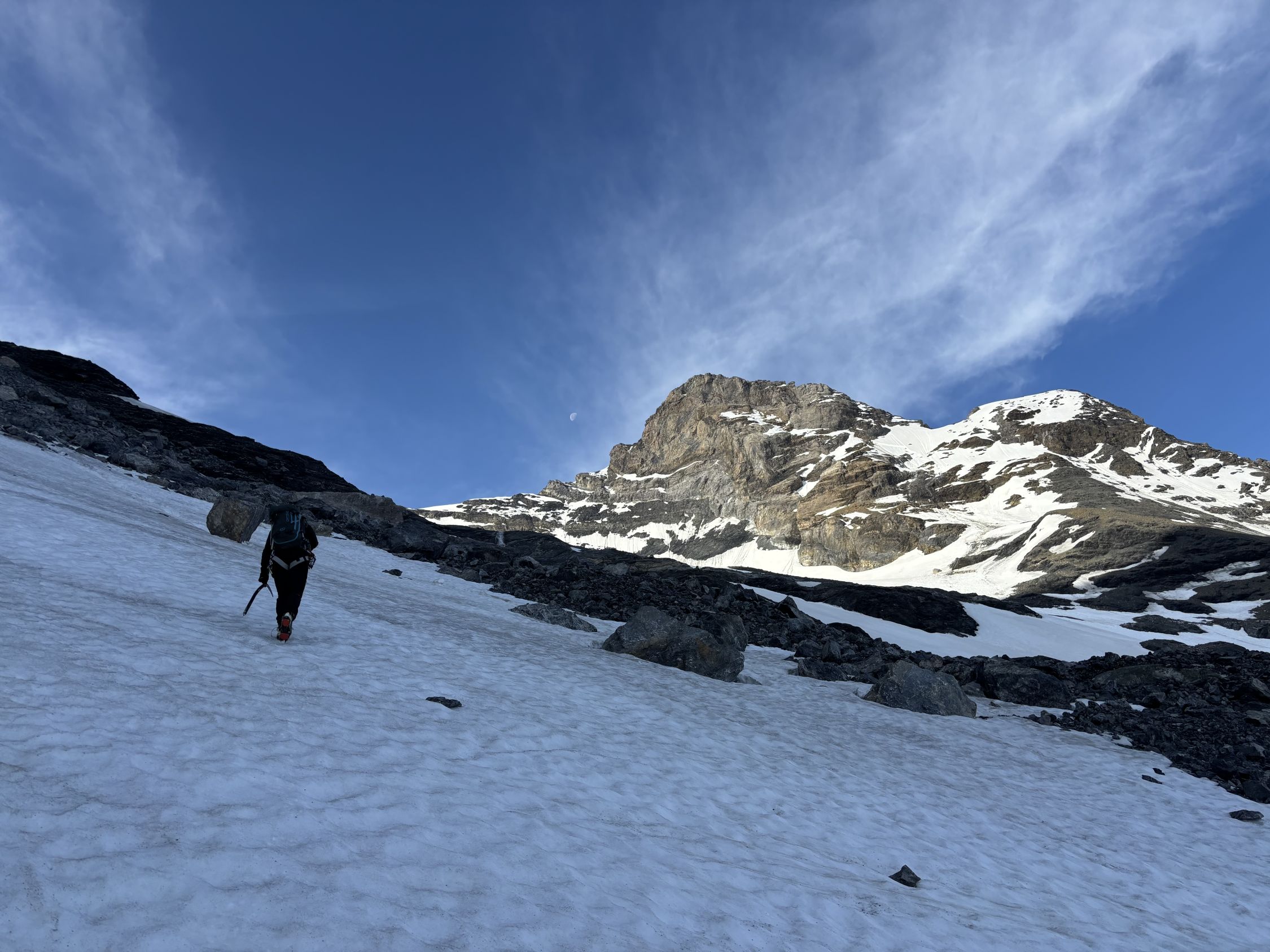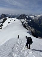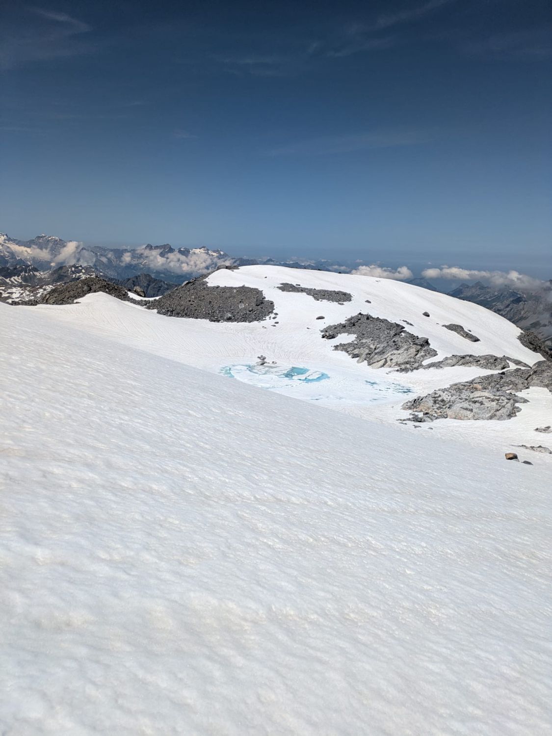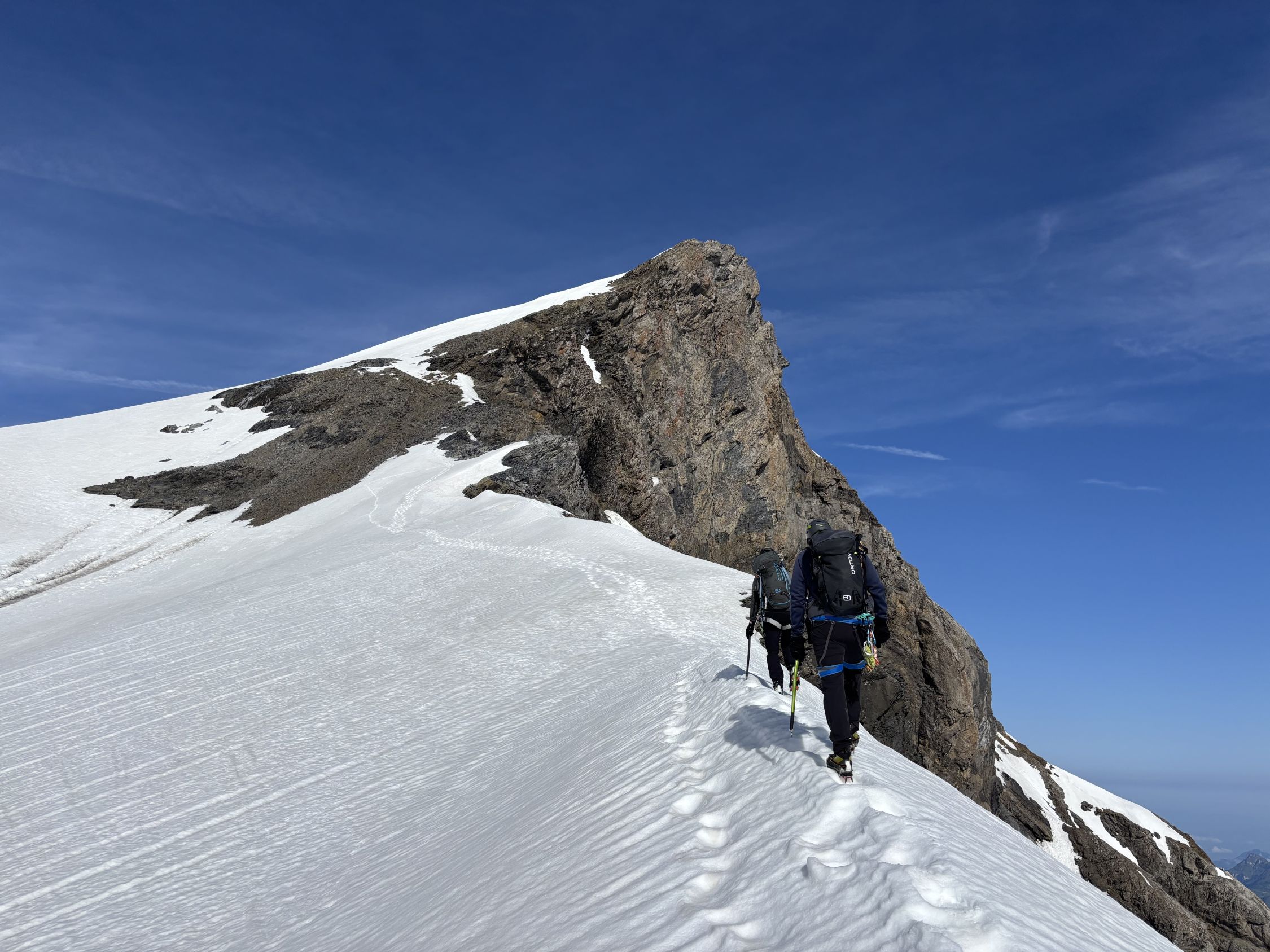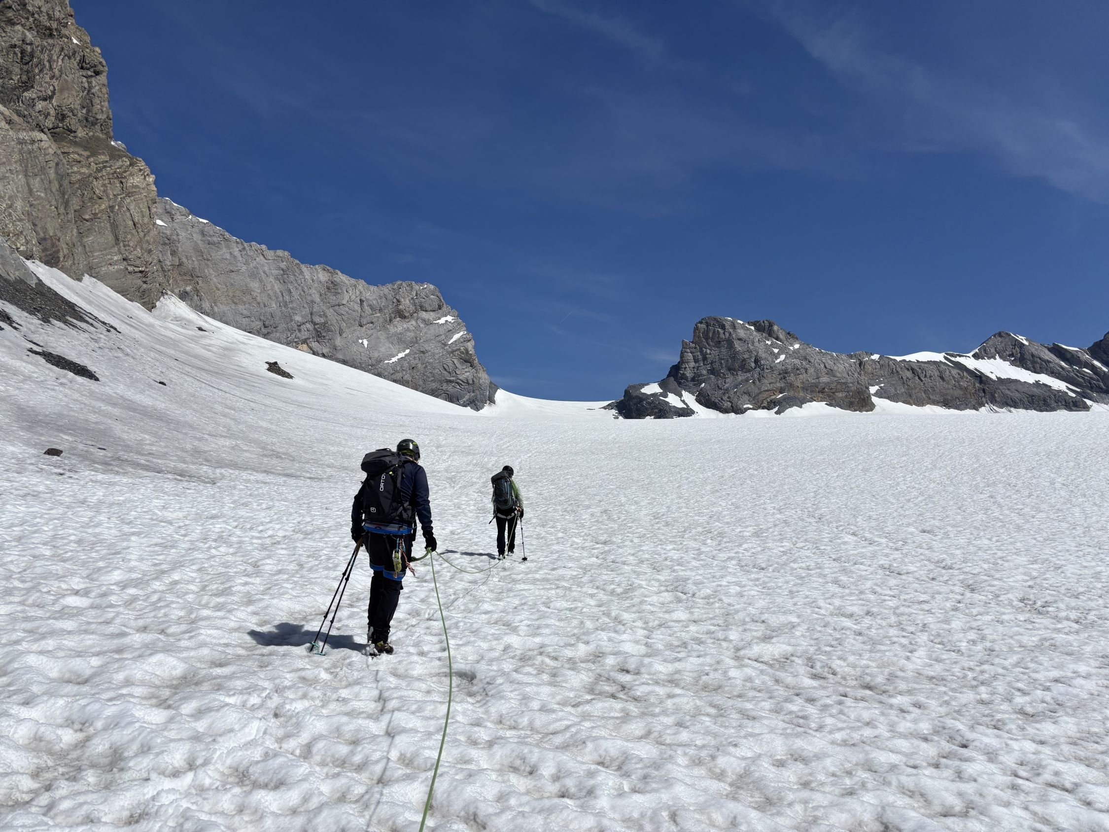 Die hohen Temperaturen lassen den Schnee rasch dahinschmelzen, wodurch der Aufstieg Chammlilücke unangenehmer wird. Mit Durchfeuchtung der Gletscherschneedecke wird die Traverse energieaufwändiger. Definitiv eine Route die im Frühsommer zu empfehlen ist.