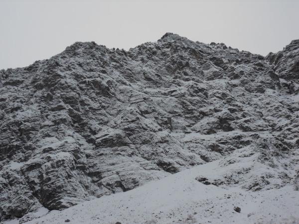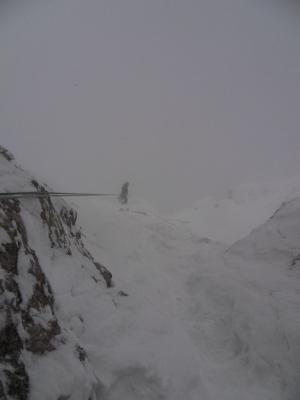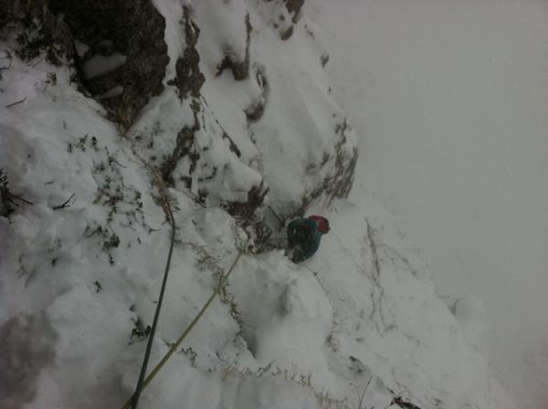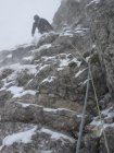 loser Pulverschnee auf Fels, noch nirgends Trittfirn. Graspolster noch nicht ganz durchgefroren. Wegen allg. noch niedriger Schneelage jedoch passabel kletterbar (letzten 3 Längen waren sehr gut).