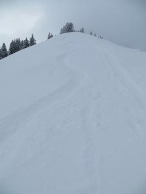 Bin alles auf dem Rücken aufgestigen und letzte 50hm auf Merlas von der Van-Normalroute aus in der Ostflanke --> Dank enger Bewaldung problemlos, ansonsten bereits Wummgeräusche bei durchschnittlich 60cm Pulver mit ca. 20cm kompakter Unterlage.