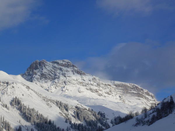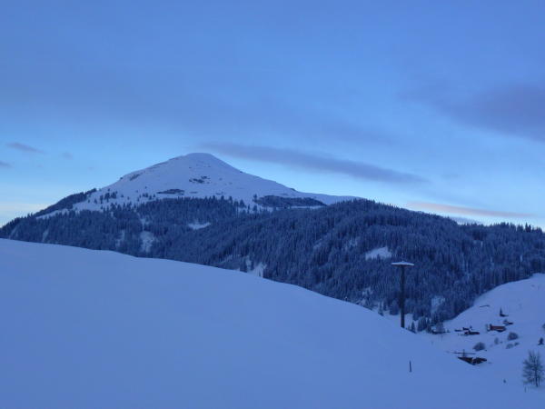 kapp genügend Schnee. Die Unterlage ist sehr dünn oder nicht vorhanden. Darüber sehr schöner Pulverschnee. Wenn die noch gut sichtbaren grossen Steine umfahren werden, reicht der Schnee. Kurz vor dem Gipfel umgekehrt wegen zunehmend schlechter werdender Sicht und einsetzendem Schneefall