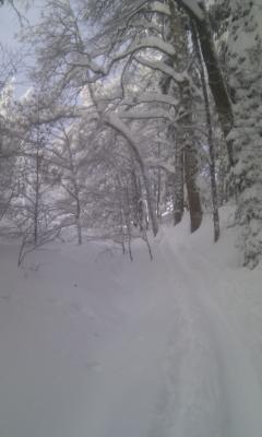 Sehr viel Schnee,schön verschneite Wälder und gute Aufstiegsspur, mit einigen umgestürtzten Bäumen als Hindernisse auf der Spur. Die Abfahrten sind schon sehr verfahren, aber noch sehr gut machbar.